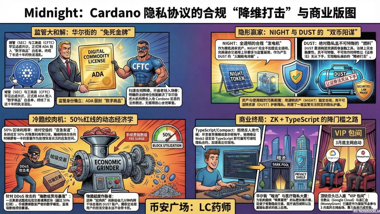 细品Midnight的底层架构,你会发现这帮原教旨极客,他们似乎是三年前就预判了SEC今天的决定。作为一个主打隐私的公链,它的主币NIGHT居然是完全不加密、全透明的。很多人一开始骂这算什么隐私链,其实这才是最高维度的阳谋。这帮极客早就看透了,你敢像门罗币那样搞全匿名去冲塔,迟早被监管弄死在下水道里。所以他们把NIGHT做成了全透明的资本资产,完美迎合了各大合规交易所的上币要求和SEC的监管凝视。