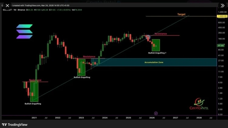 Pero ojo, que la visión a largo plazo es la que te vuela la cabeza. 🤯 Si miramos el mapa grande, Solana viene respetando una línea de soporte desde el 2021. Cada vez que toca ese suelo, aparece una "vela envolvente alcista", que en cristiano significa que los compradores entran con todo y se llevan por delante a los vendedores. Si esta estructura se mantiene y la red sigue dominando los RWA como hasta ahora, los analistas ya están proyectando un objetivo de 1,000 dólares para el 2027.