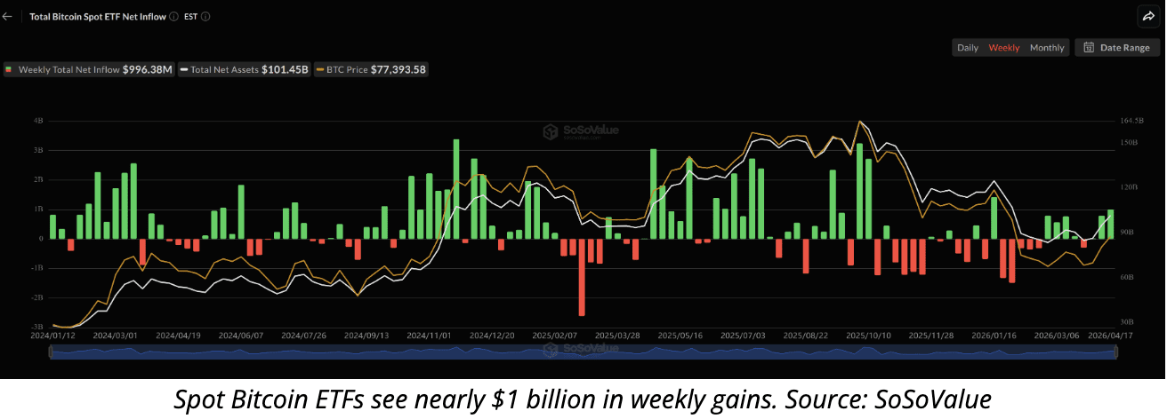 Spot Bitcoin ETFs recorded nearly $1 billion in inflows last week, their strongest performance since January, highlighting continued institutional demand even as Bitcoin slipped back below $76K. Renewed uncertainty around Iran and the Strait of Hormuz pushed oil prices higher again, reversing Bitcoin’s brief breakout above $78K and pulling the market back into its multi-month trading range.