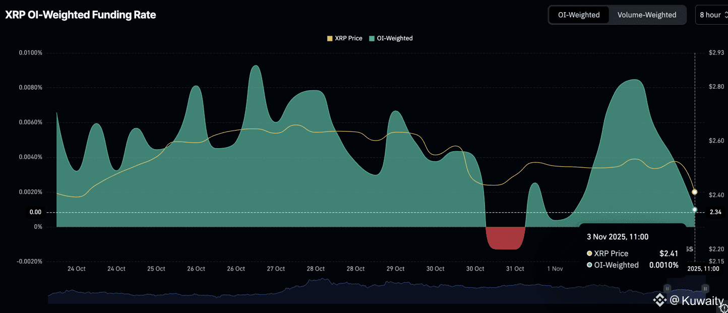 يواجه رمز تحويل الأموال عبر الحدود، XRP، هيكلًا تقنيًا ثقيلًا، تفاقم بسبب تراجع الطلب من الأفراد. منذ عمليات البيع الضخمة في 10 أكتوبر، التي triggered liquidations للعملات المشفرة بقيمة تزيد عن 19 مليار دولار، ظلت نسبة التمويل الموزونة حسب الفائدة المفتوحة لـ XRP مضغوطة بشكل كبير.