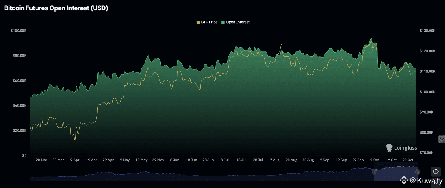 وبالمثل، لا يزال الاهتمام من الأفراد مضغوطًا وسط ضعف سوق المشتقات. وفقًا لبيانات CoinGlass، يبلغ متوسط الفائدة المفتوحة للبيتكوين (OI)، التي تتعقب القيمة الاسمية لعقود الآجلة المعلقة، حوالي 70 مليار دولار في وقت كتابة هذا التقرير، بانخفاض من 94 مليار دولار، وهو المستوى الأقصى في أكتوبر.