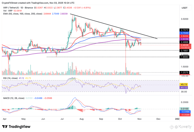 أما بالنسبة لـ XRP، فإن مشاعر العزوف عن المخاطر لا تزال سائدة، مما يدفع الثيران للقتال للدفاع عن دعمهم قصير الأجل عند 2.40 دولار. مؤشر القوة النسبية (RSI) عند 41 ويتراجع على الرسم البياني اليومي، مما يشير إلى أن الدببة لها اليد العليا.