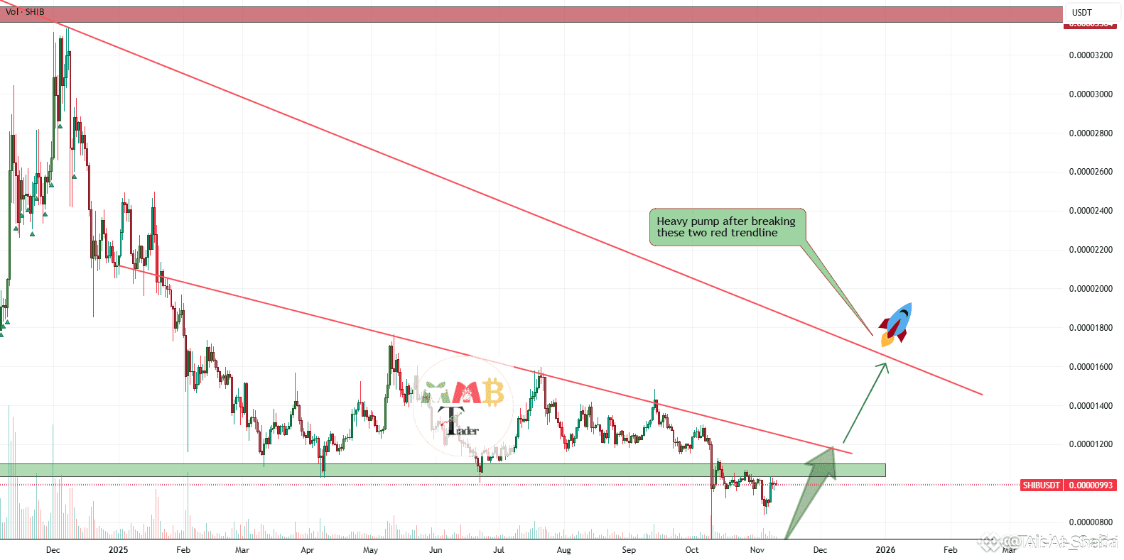 كما هو ملاحظ على مخطط SHIBUSDT، يمر السعر بمرحلة تصحيح قوية، حيث يواجه رفضًا متكررًا عند مستويين مميزين من خطوط الاتجاه الهابطة (المقاومات الديناميكية). وكل اختبار لهذه المقاومات أدى إلى عمليات بيع لاحقة.