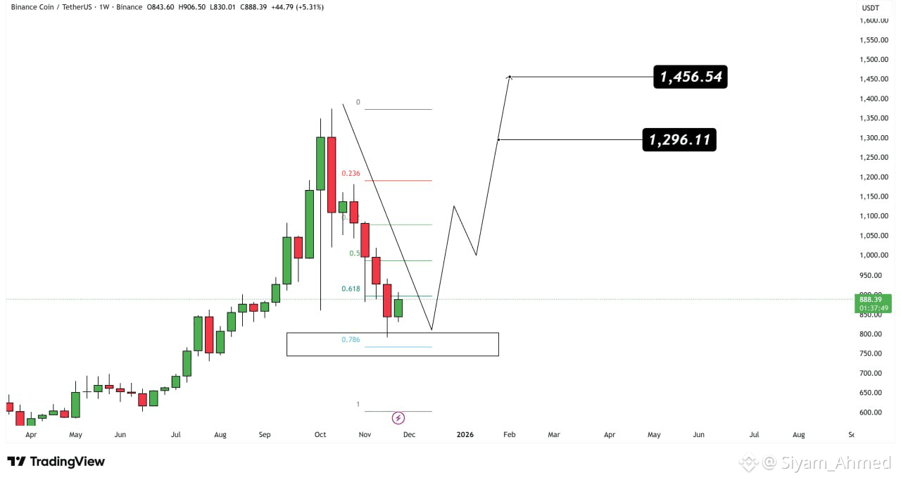 $BNB is showing strong signs of a potential macro reversal after reacting cleanly from the 0.786 Fibonacci weekly demand zone. This area has historically acted as a powerful support, and buyers are once again stepping in with confidence. The recent price reaction suggests selling pressure is weakening, while accumulation is taking place at this key level. As long as BNB continues to hold above this weekly support block, the probability of a bullish expansion remains high. A successful continuation could trigger a strong upside move and shift overall market structure back into an uptrend. If momentum builds, the next major resistance levels to watch are $1,296.11 followed by $1,456.54. Patience and confirmation are key as this setup develops.