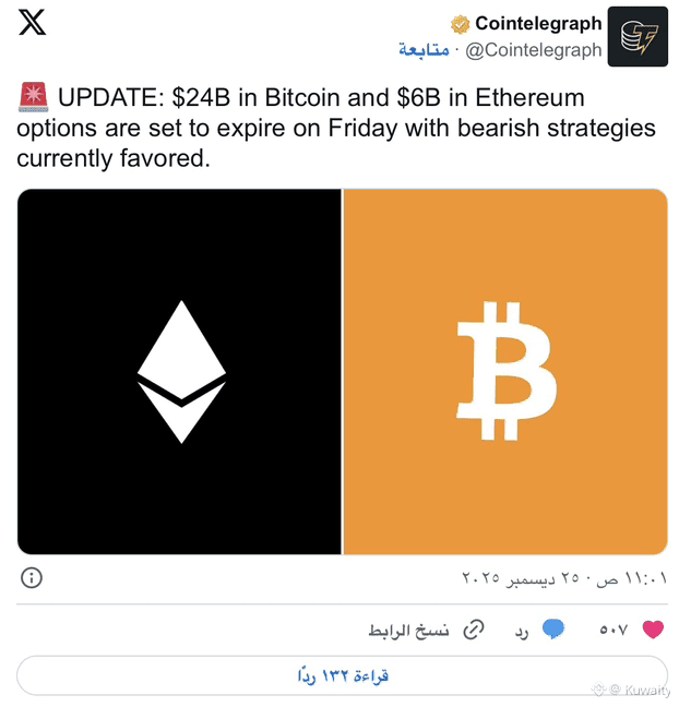 يقف سوق العملات المشفرة عند نقطة تحول حساسة مع استعداد المتداولين لحدث ضخم في سوق المشتقات. تقترب عقود بيتكوين بقيمة تقارب 24 مليار دولار، وعقود إيثريوم بقيمة 6 مليارات دولار، من موعد الانتهاء يوم الجمعة. نادرًا ما تمر مثل هذه المراكز الكبيرة بهدوء، خصوصًا عندما تميل معنويات السوق إلى السلبية.