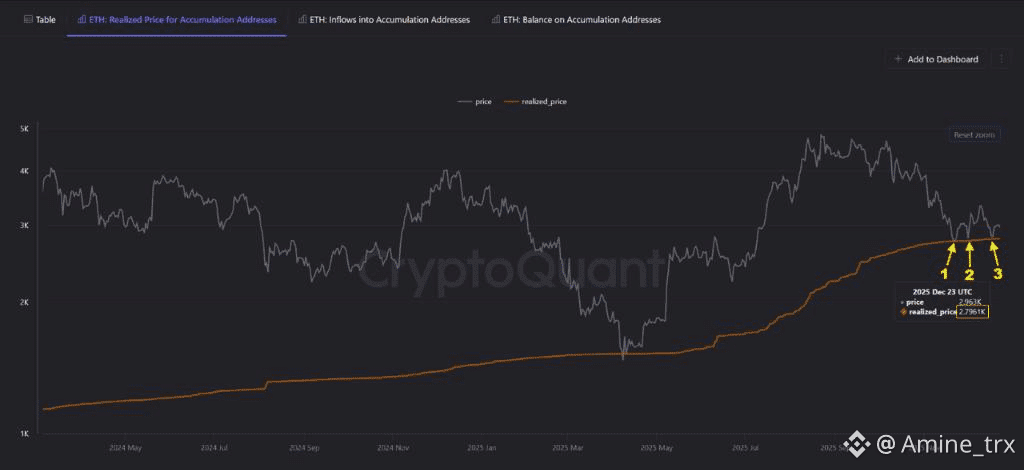 تشير البيانات إلى أن مستوى 2796 يمثّل أساس التكلفة المحققة لحاملي ETH على المدى الطويل. اللافت أن السعر ارتدّ عن هذا المستوى ثلاث مرات متتالية، ما يعكس وجود طلب قوي من المحافظ الكبيرة.
