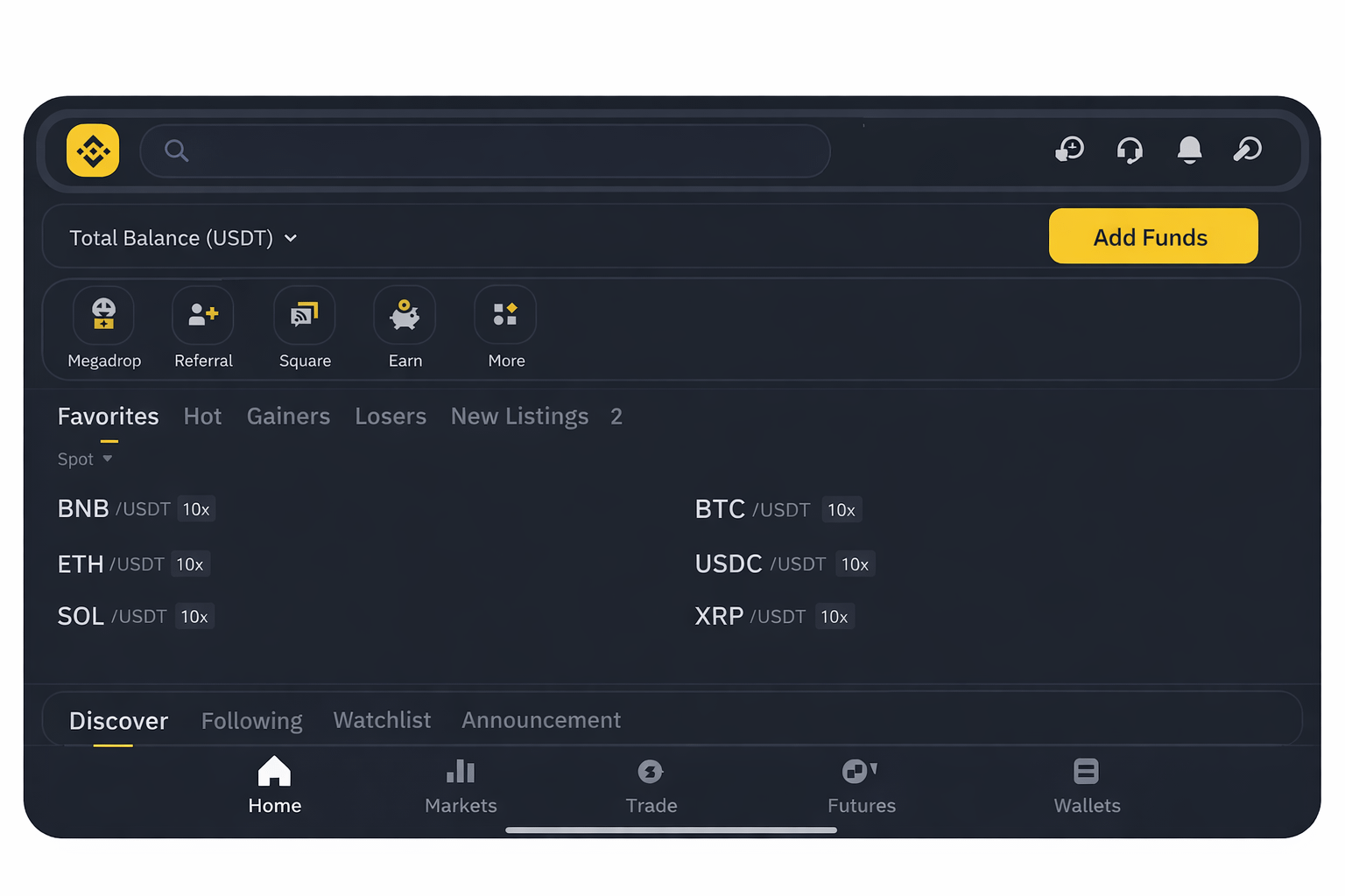Mình chỉ tập trung vào ba khu vực chính là Markets, Trade và Wallet. Markets là nơi mình xem thị trường, Trade là nơi mình thực sự đặt lệnh, còn Wallet là nơi mình kiểm tra tài sản. Những phần như Futures hay Earn mình chỉ đụng tới khi đã có nhu cầu cụ thể.