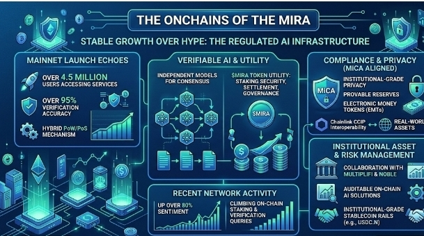 Just yesterday, chatter spiked around a fresh collaboration: Mira Network teaming with Multiplifi and Noble to build verifiable AI for automated institutional asset and risk management. Leveraging institutional-grade stablecoin rails (think USDC.N or similar regulated flows), it's pushing AI-driven solutions that are auditable on-chain. Sentiment flipped bullish fast—up over 80% in some trackers—with volume jumps signaling real interest. No specific proposal ID or block number leaked in the noise yet, but the on-chain activity tied to staking pools and verification queries has been climbing steadily since mainnet. It's one of those ecosystem moves that quietly shifts liquidity toward utility over speculation.