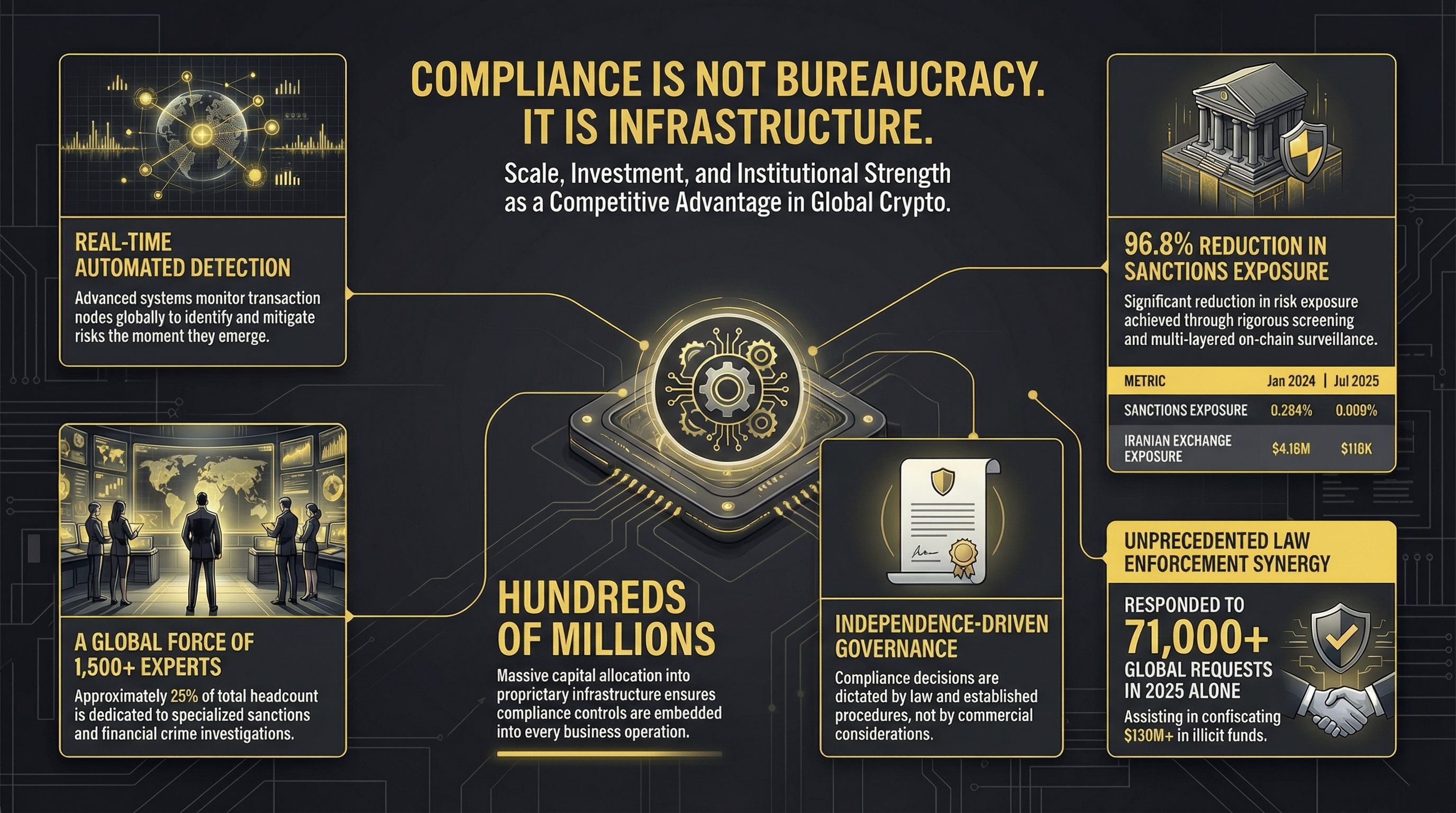 This is a deliberate architecture, not a reaction to external pressure. By investing hundreds of millions of dollars and dedicating 25% of our workforce to this mission, we are making an unbreakable promise to our users and the global community. The data—from the 97.3% reduction in Iranian exchange exposure to the tens of thousands of law enforcement collaborations—speaks to a standard of excellence that is setting the pace for the entire industry.