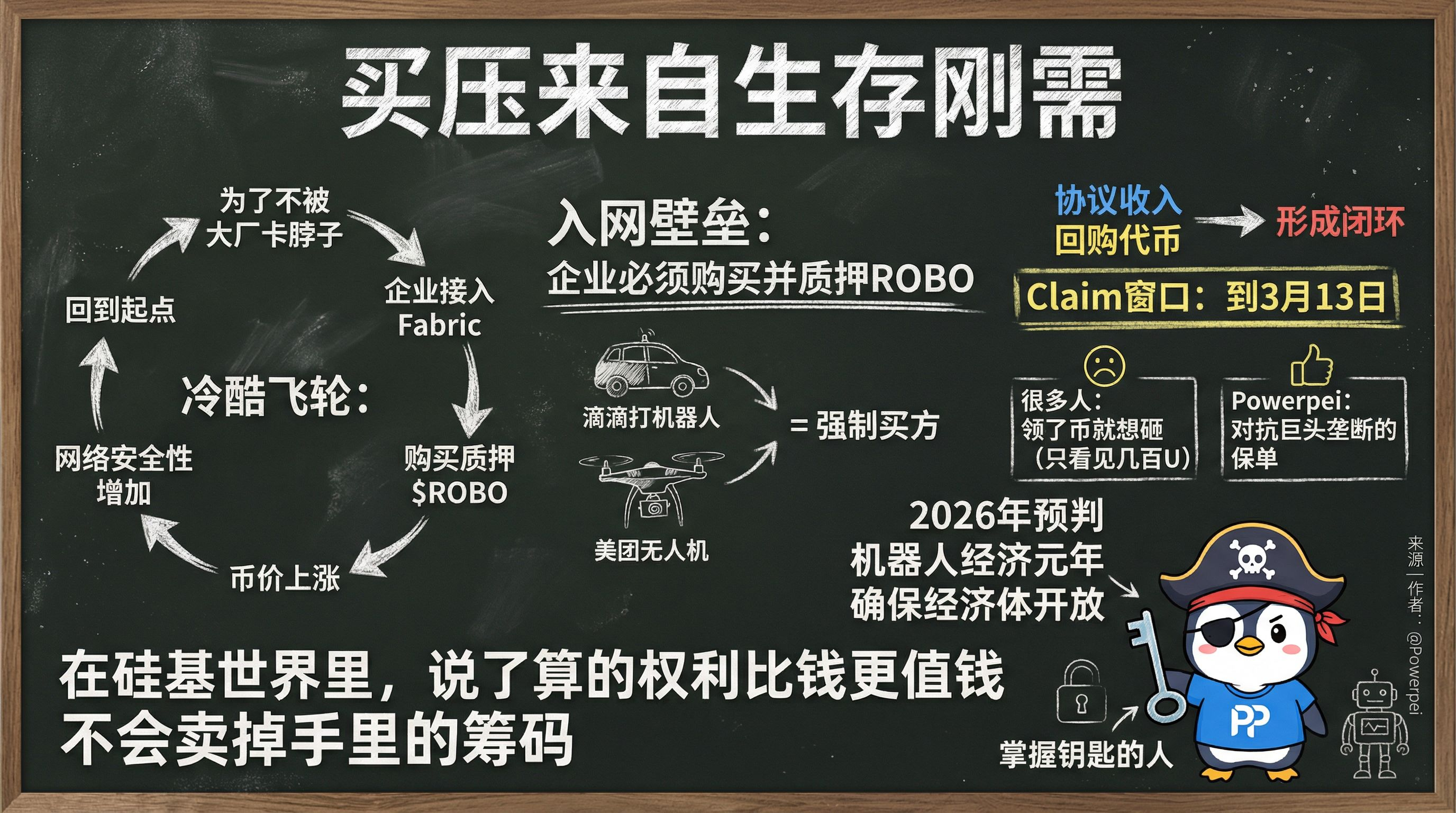 Um nicht von großen Unternehmen in die Enge getrieben zu werden -> Unternehmen integrieren Fabric -> Kaufen und staken ROBO -> Preis steigt -> Netzwerksicherheit erhöht.