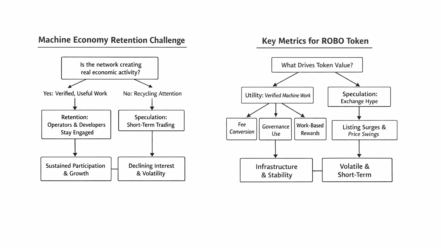 Still, here’s the part that made me take a second look. Fabric is not really framing rewards like a standard proof of stake system where capital sits there and collects yield for existing. In the whitepaper, the reward logic is tied to verified work, quality, and recent activity. It explicitly says passive eligibility is out, verified tasks are in, and that a participant with lots of tokens but zero work gets zero rewards. That sounds small until you think through the market consequences. Most crypto networks can survive a while on financial loops alone. Fabric is trying to force a service loop. Work has to happen, get verified, and stay good enough to keep earning. Think of it like a warehouse payroll system instead of a dividend stream. No shift, no pay. That design goes straight into the retention question. A lot of machine or AI adjacent tokens can attract traders for a month. Very few can retain operators over quarters. Fabric’s model only really holds together if people keep showing up to do the hard part: perform tasks, submit verifiable contributions, maintain quality, and accept that rewards decay without ongoing activity. The whitepaper even frames this as a self stabilizing participation dynamic where active contributors should rise or fall with network demand. In theory, that’s healthier than paying people for parking capital. In practice, it creates a much tougher test. If real task demand is thin, retention weakens fast because the token has less operational gravity pulling people back in. That’s also where my main frustration sits. Fabric’s core idea is sharp, but sharp ideas in crypto still run into ugly execution realities. Verifying machine work is only valuable if the market believes the verification maps to something economically meaningful. If proofs become easy to game, too abstract for buyers to understand, or disconnected from actual demand for robotic services, the whole structure starts drifting back toward narrative speculation. Even Fabric’s own documents lean on future primitives around verifying work, compliance, efficiency, power consumption, and user feedback. That tells me the architecture is aiming far, but it also tells me some of the hardest commercial validation still sits ahead, not behind. So what am I watching? Not just price. I’m watching whether the network starts showing evidence that proof based participation is becoming habit rather than event driven behavior. The whitepaper targets a mature state where 60% to 80% of token value derives from structural utility rather than speculation, and it treats that ratio as a health metric. That’s ambitious. Maybe too ambitious early. But it gives traders a useful lens: is ROBO being pulled by actual work bonds, fee conversion, and governance use, or is it mostly being pushed around by exchange flows and new listing attention? Right now, with the token already off its March 2 peak and market activity cooling from recent surges, I’d say that question is still open. What would change my mind in either direction is pretty simple. If Fabric can show repeated, understandable proof that machine activity on the network is real, economically relevant, and hard to fake, then the retention loop gets stronger and the token starts looking less like a short cycle trade and more like infrastructure with teeth. If it can’t, the market will eventually treat “verified machine work” as just another clever phrase that never found durable demand. That’s why this one is worth watching closely right now. Don’t trade ROBO like a robot story. Trade it like a live test of whether crypto can finally pay for proven work instead of promised work, and be honest about which side of that line the network is actually standing on.