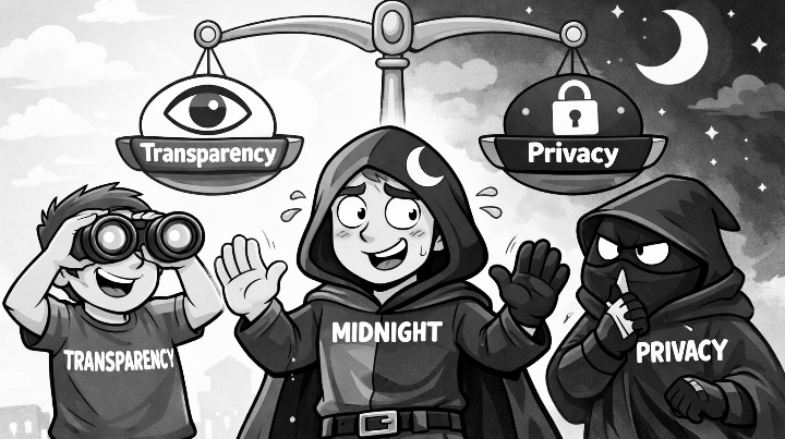 Das Bild repräsentiert dieses Konzept perfekt. Auf der einen Seite beobachtet die Transparenz alles offen. Auf der anderen Seite schützt die Privatsphäre Informationen vor unnötiger Offenlegung. In der Mitte steht Midnight, das Gleichgewicht symbolisierend. Anstatt eine Seite zu bevorzugen, fungiert es als Brücke zwischen den beiden Welten.