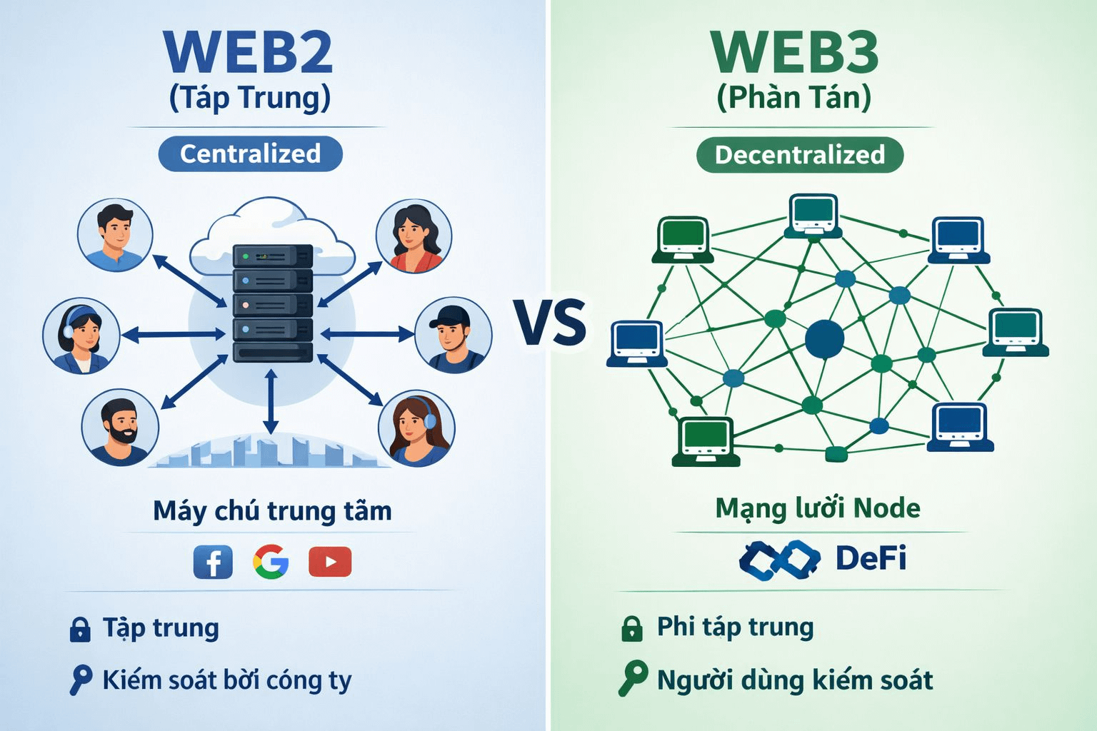 Kiến trúc hạ tầng: Web2 theo mô hình máy chủ–máy khách tập trung, trong đó các nền tảng lớn kiểm soát hạ tầng và lưu trữ dữ liệu tại một trung tâm. Dữ liệu (video, hình ảnh, tài liệu…) được lưu trên máy chủ riêng của nền tảng và người dùng cần truy cập qua dịch vụ của họ. Trong khi đó, Web3 hoạt động trên mạng lưới phân tán (blockchain) với hàng nghìn nút trên toàn cầu cùng chia sẻ và xác minh dữ liệu. Mọi tương tác (giao dịch tiền điện tử, hợp đồng thông minh…) đều được ghi công khai trên chuỗi và không lệ thuộc vào bất kỳ máy chủ trung tâm nào.