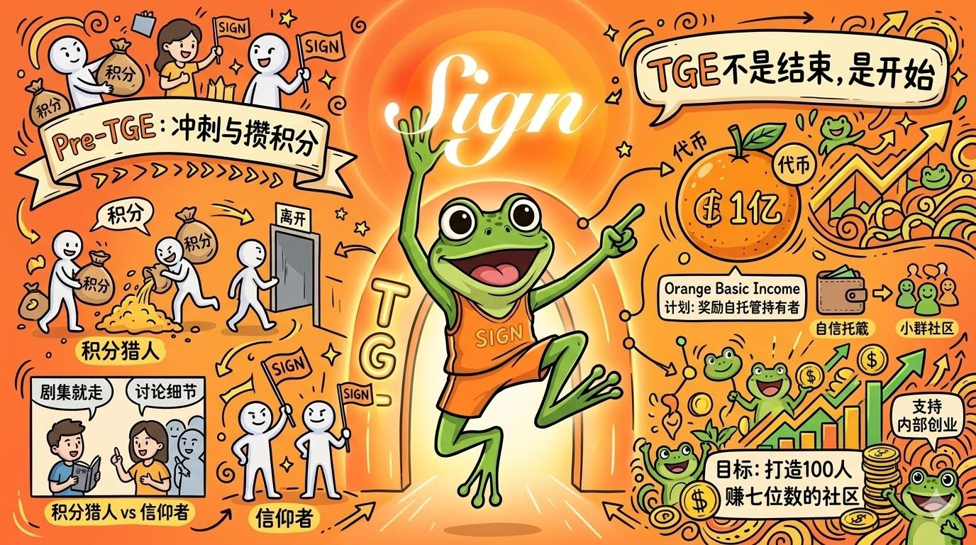 Sign选择了一条不一样的路,TGE不是结束,而是下一阶段的开始,这句话是Yan Xin自己说的,不是营销文案。TGE之后,基金会用代币支持社区内部创业,让社区认知到跟着Sign可以赚钱,这个设计的逻辑是把社区从领完走人变成留下来一起做事。2026年3月23日上线的Orange Basic Income计划,拿出1亿枚代币奖励自托管钱包里的$SIGN 持有者,这不是短期拉盘的手法,是在用代币机制筛选真正的长期持有者,愿意自托管的人,本来就不是来占便宜的那批人。
