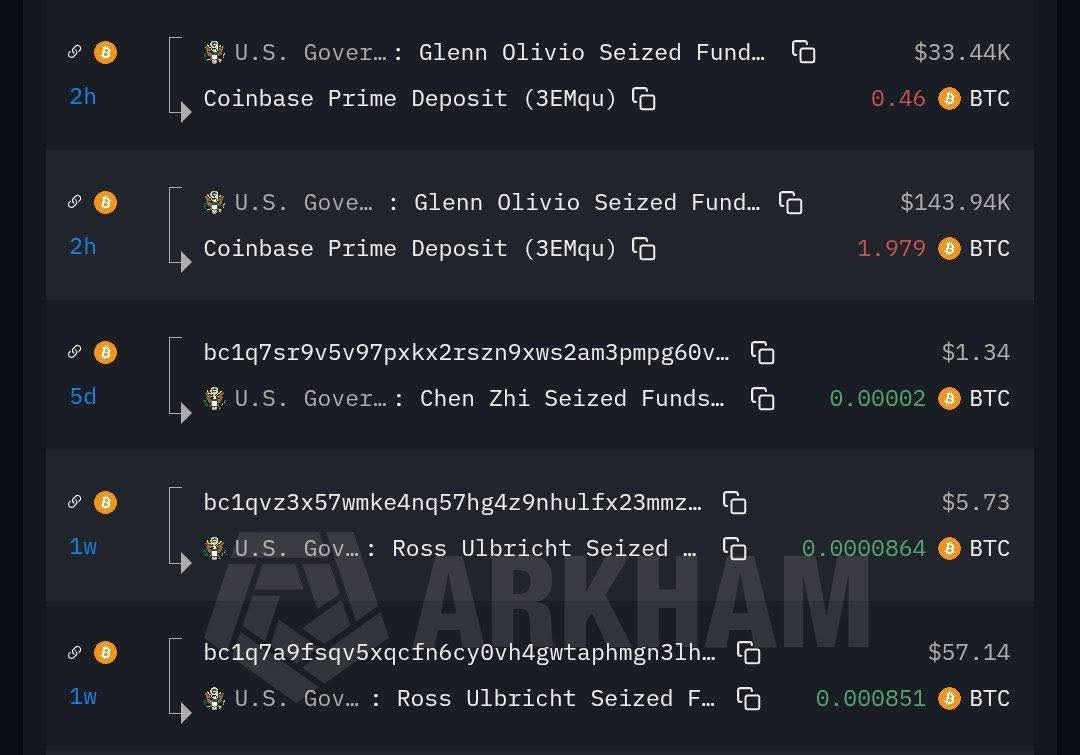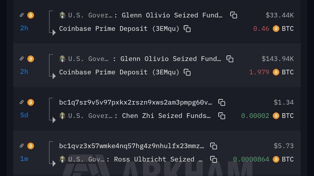 Die U.S. Regierung hat kürzlich 2.4 BTC (~$177k) an Coinbase Prime überwiesen. Identifiziert von Arkham Intelligence, sind die Mittel mit dem Steroidverurteilten Glenn Olivio aus dem Jahr 2025 verbunden.