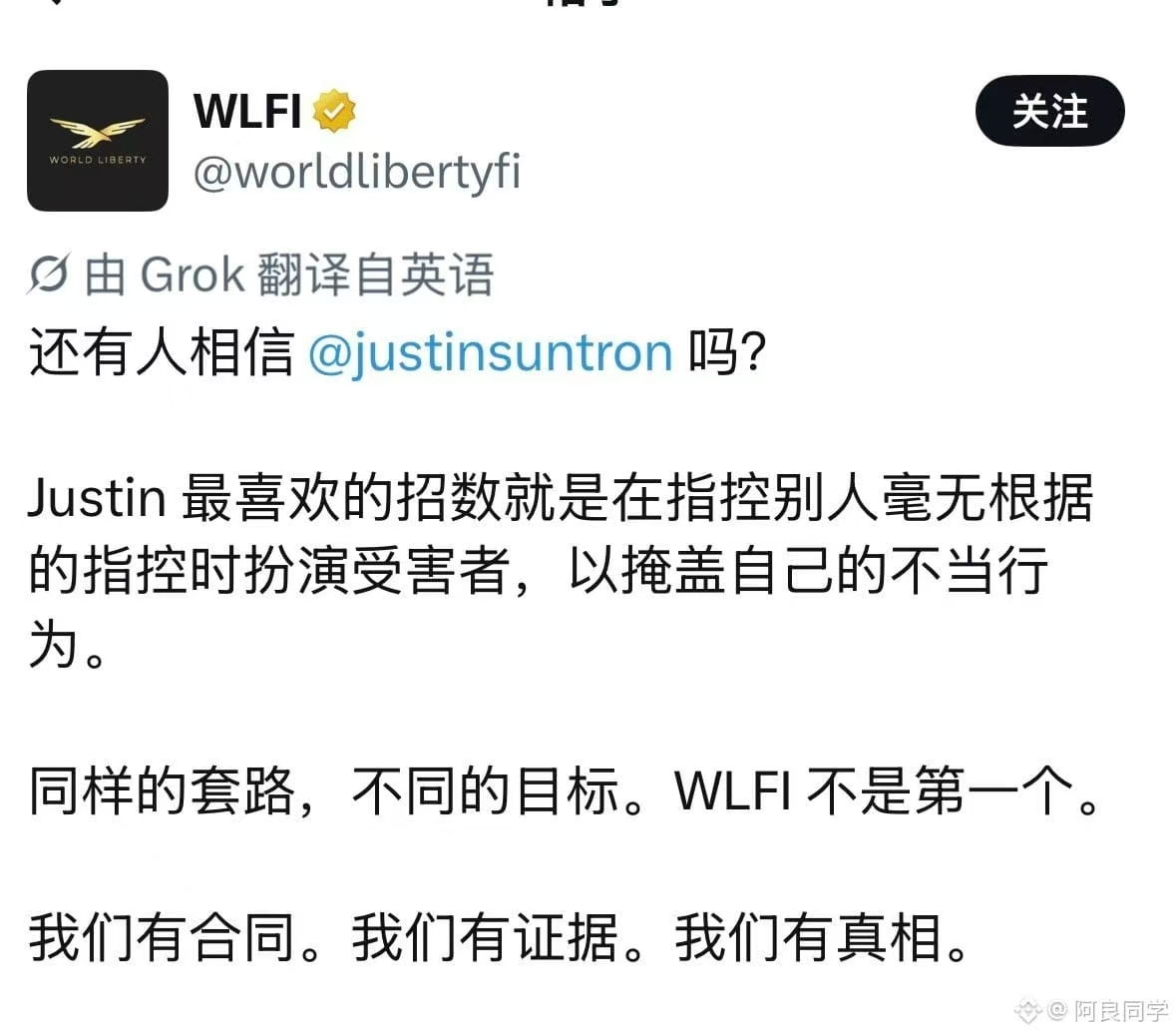 WLFI在回复中称孙宇晨的做法是“一边扮演受害者,一边以毫无根据的指控来掩盖自己的不当行为”,并称“我们有合同,我们有证据,我们有真相。”