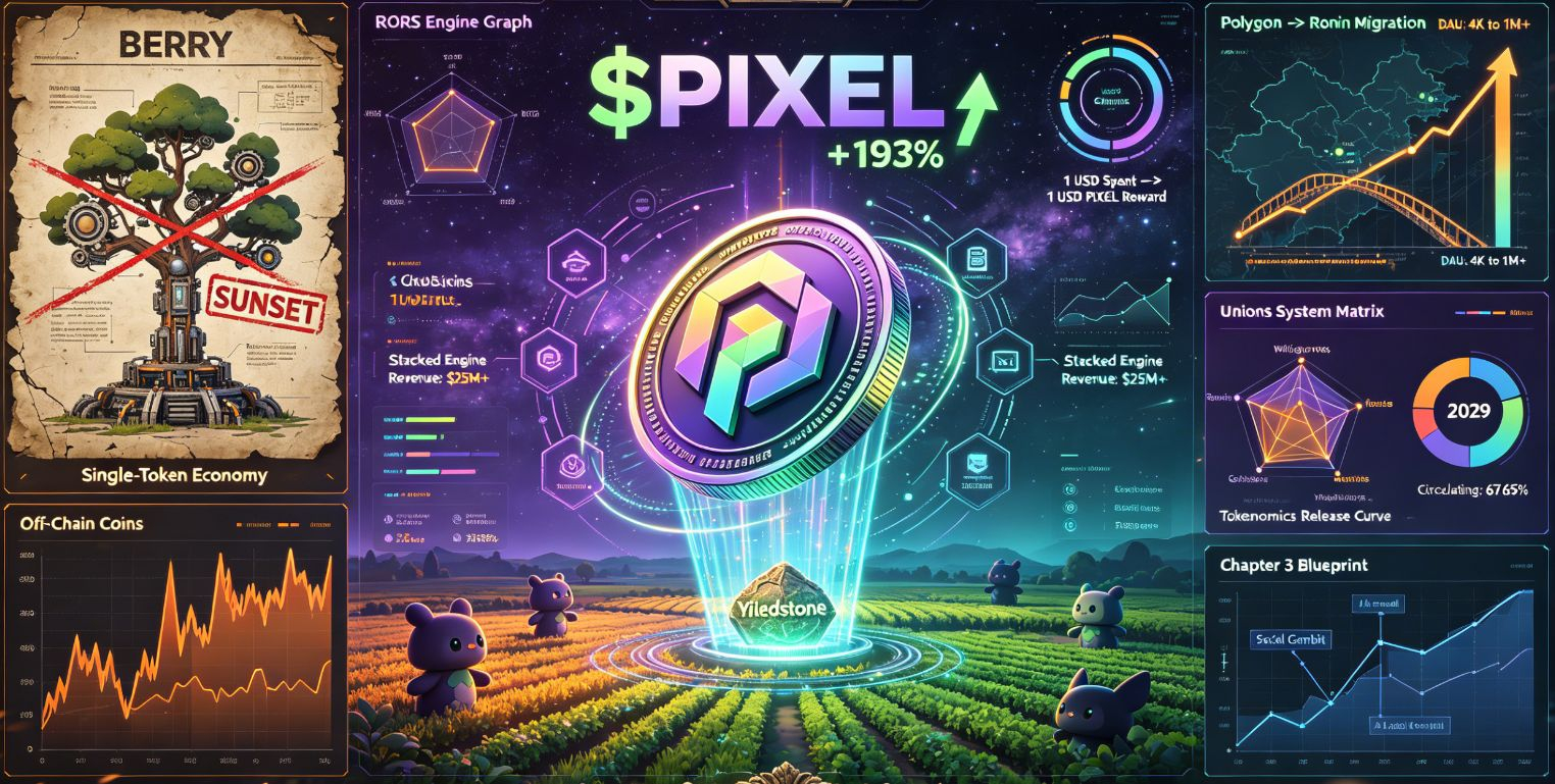 Pixels从Polygon迁到Ronin,DAU从四千干到百万级别,靠的不是什么花里胡哨的营销,是把传统游戏的趣味性和Web3的所有权逻辑真正揉在了一起-。这波$PIXEL 的拉升,背后是长达一年的经济模型调整、是壮士断腕的BERRY sunset、是Chapter 3引入的社交博弈机制、是RORS这个已经跑通的自循环引擎——说人话就是,它不是靠嘴拉起来的。