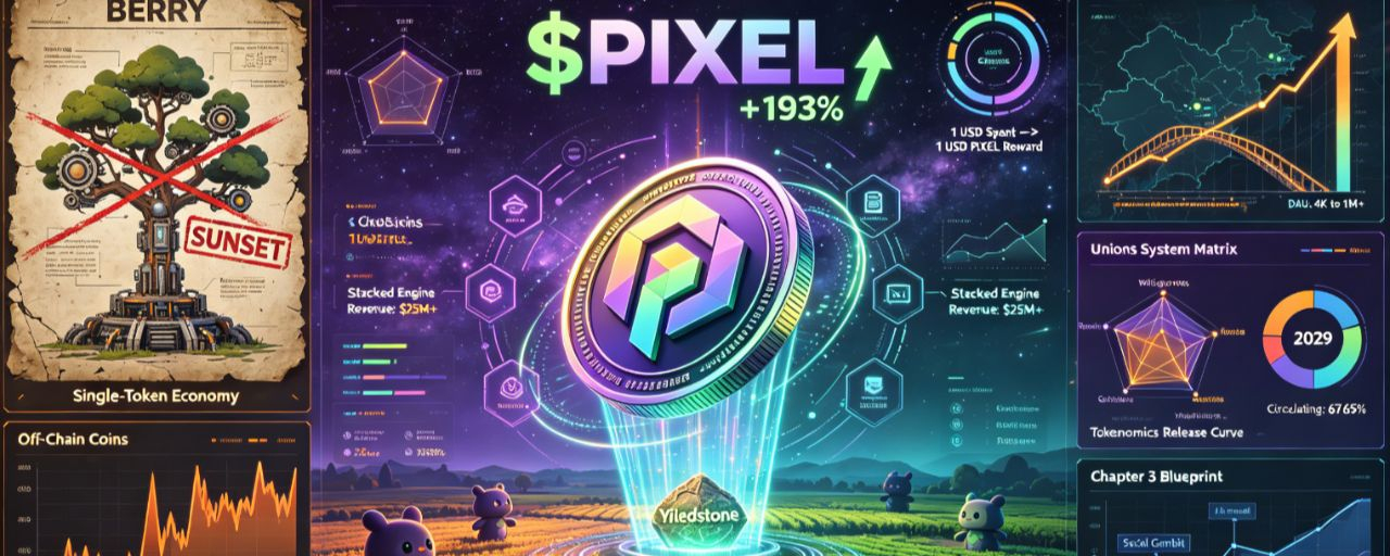 这事儿得从@Pixels 最狠的一个决定说起。做链游的人都知道双代币模型是个死结——通胀币迟早把经济系统拖进泥潭。Pixels当初的BERRY就踩了这个坑,日均通胀飙到2%,眼看着要崩。换别的团队,大概率是遮遮掩掩、改改参数继续混。但Luke Barwikowski这人愣是直接下了狠手:把BERRY整个废掉,兑成$PIXEL,日常交易逻辑转成链下的Coins,把$PIXEL扶正为生态里唯一的链上代币-。