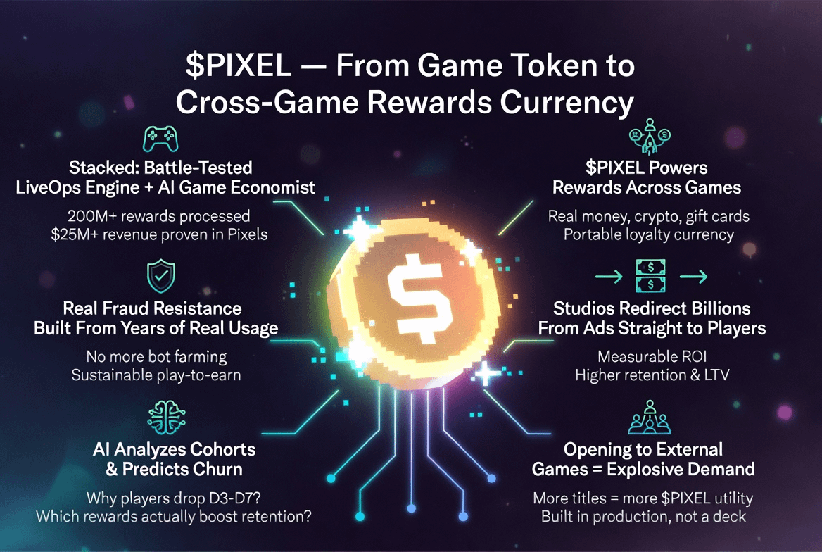 I first saw it inside Pixels and thought it was just another rewards layer. But the more I dug in, the more I realized this isn’t some fresh idea on paper. Stacked is the system the Pixels team built after years of watching play-to-earn break down. They lived through the bots, the farming, the economy crashes. Instead of repeating the same mistakes, they reverse-engineered what actually keeps players coming back and what keeps the numbers healthy. Now they’re opening that same engine to other games.