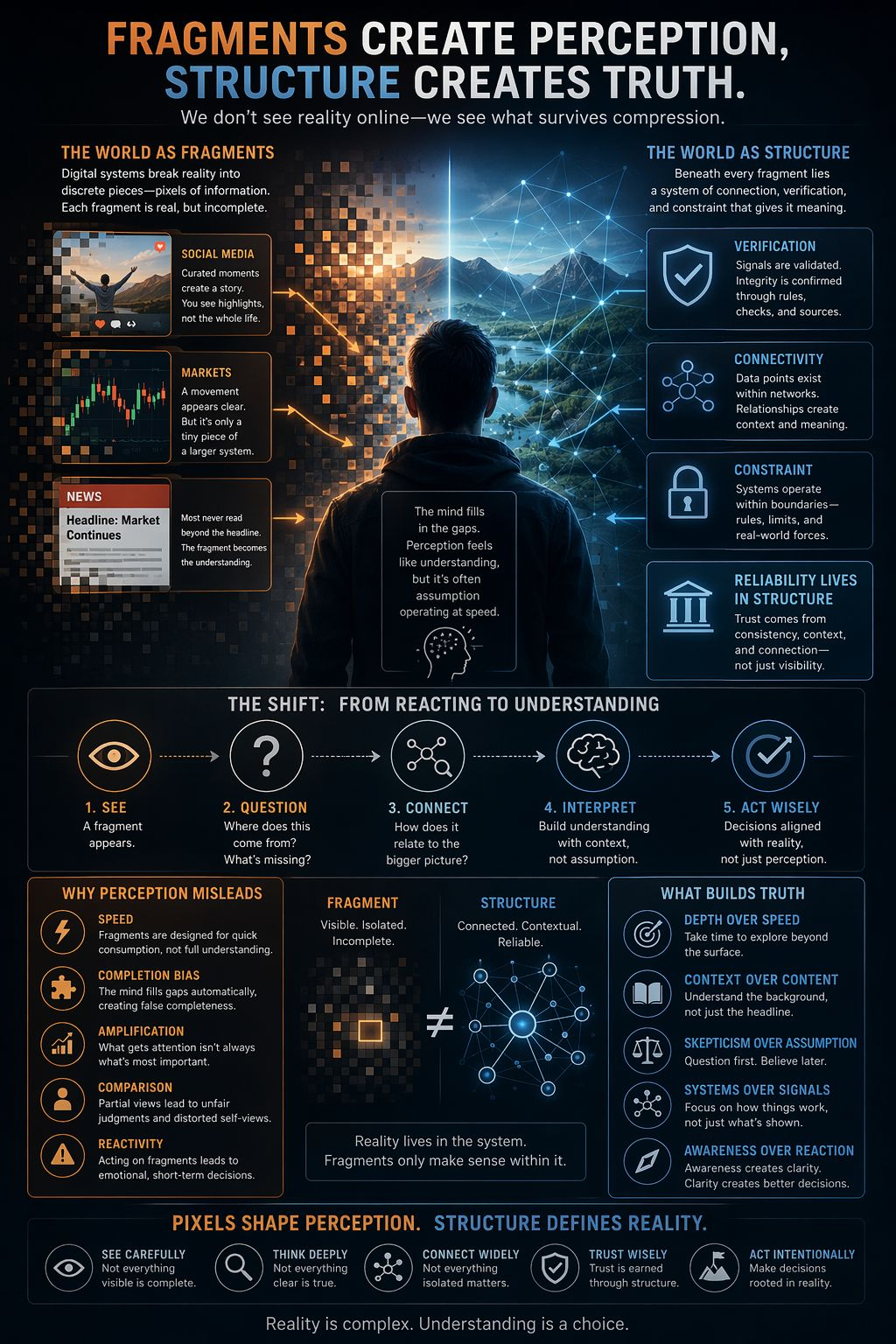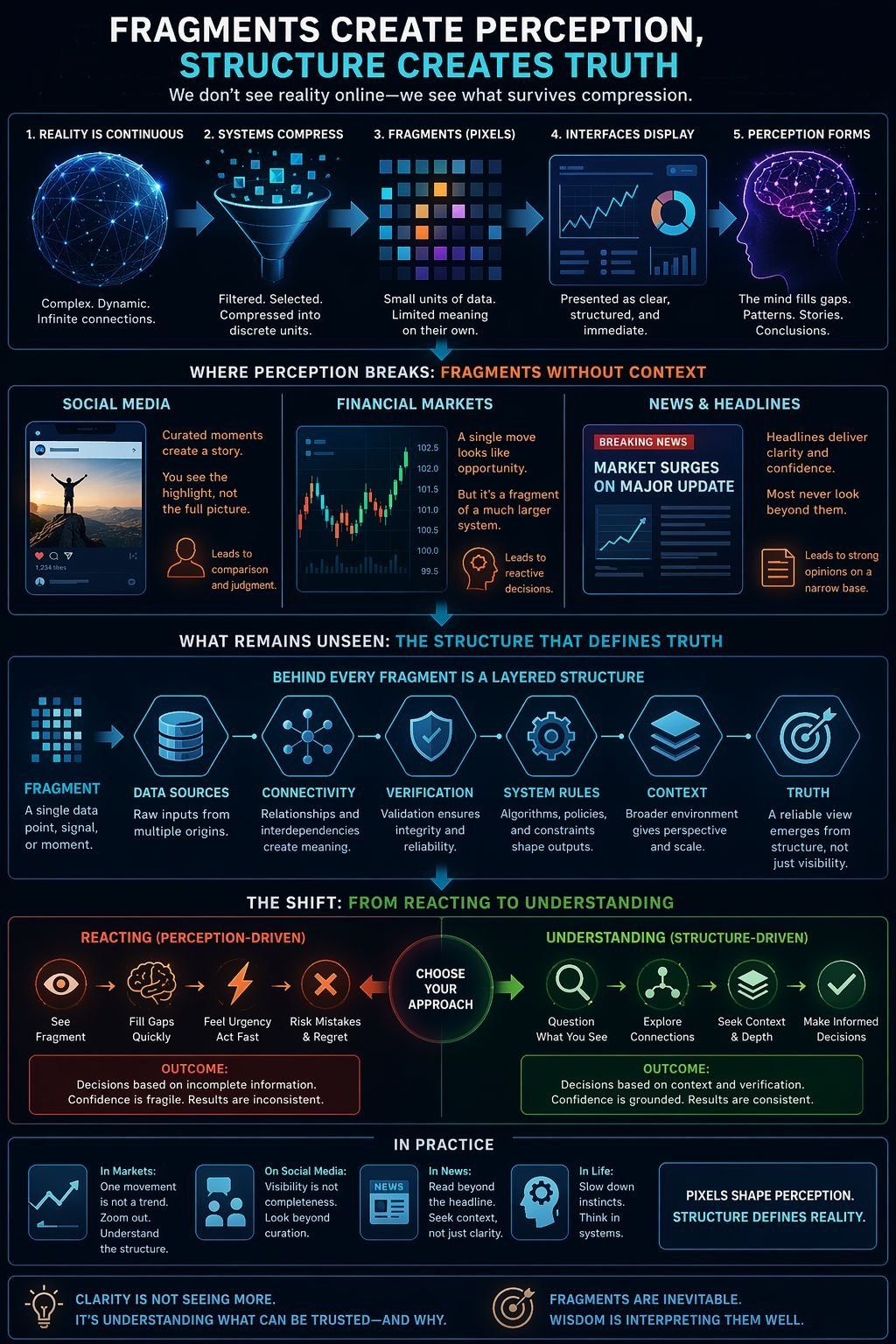 In digital environments, clarity often feels immediate and reliable. Information appears structured, interfaces feel responsive, and signals seem precise enough to act upon. Yet beneath this sense of order lies a quiet limitation: what we are seeing is not the full state of reality, but a compressed version of it. It is selected, refined, and presented in fragments—small units that feel complete in the moment but rarely are.