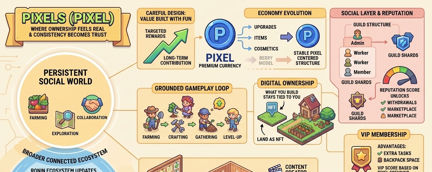 Here’s where it gets interesting. Pixels doesn’t tie every single action to the PIXEL token. And yeah, that sounds like a small design choice, but it’s not. Most GameFi systems shove the token into everything—every click, every action, every reward. That’s how you get inflation spirals. Pixels pulls back on that. Basic stuff like farming, crafting, gathering that mostly runs on softer, off-chain systems. The token only shows up when it actually matters upgrades, land mechanics, certain market interactions.