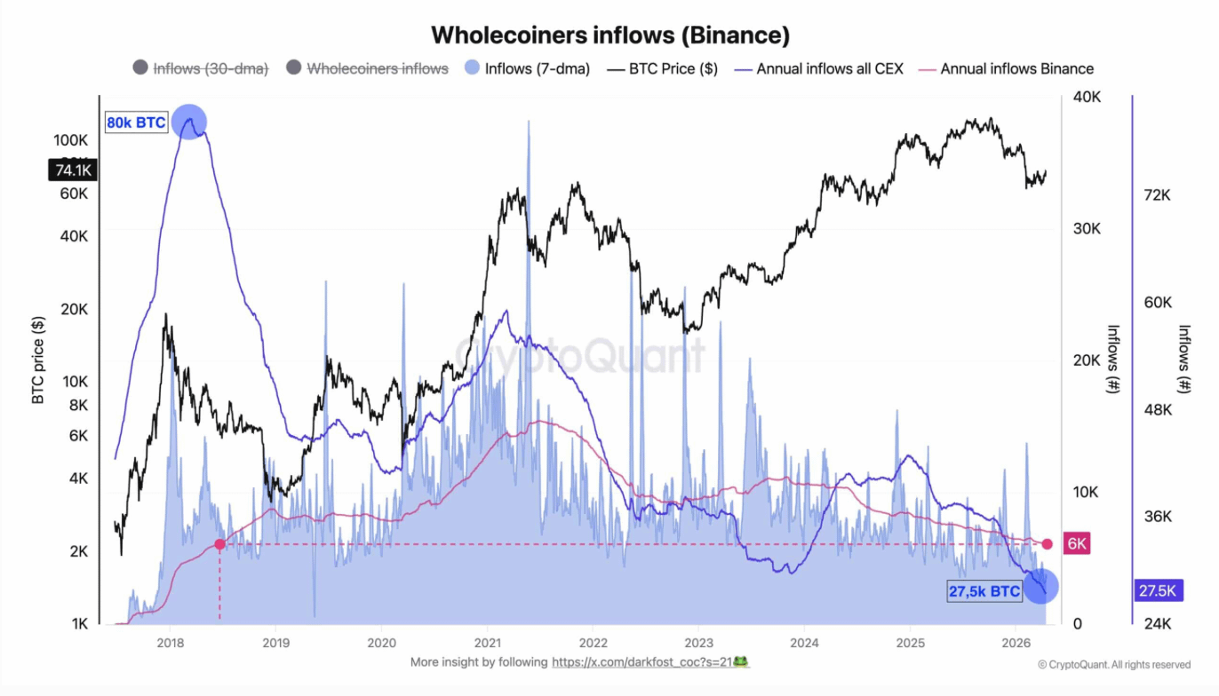 Binance Signal: Average whale inflows to Binance are hovering near 6,000 BTC, suggesting that the largest players are choosing cold storage over exchange selling.