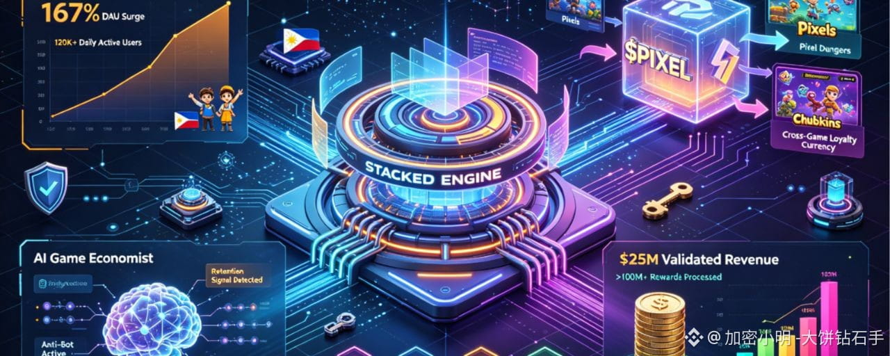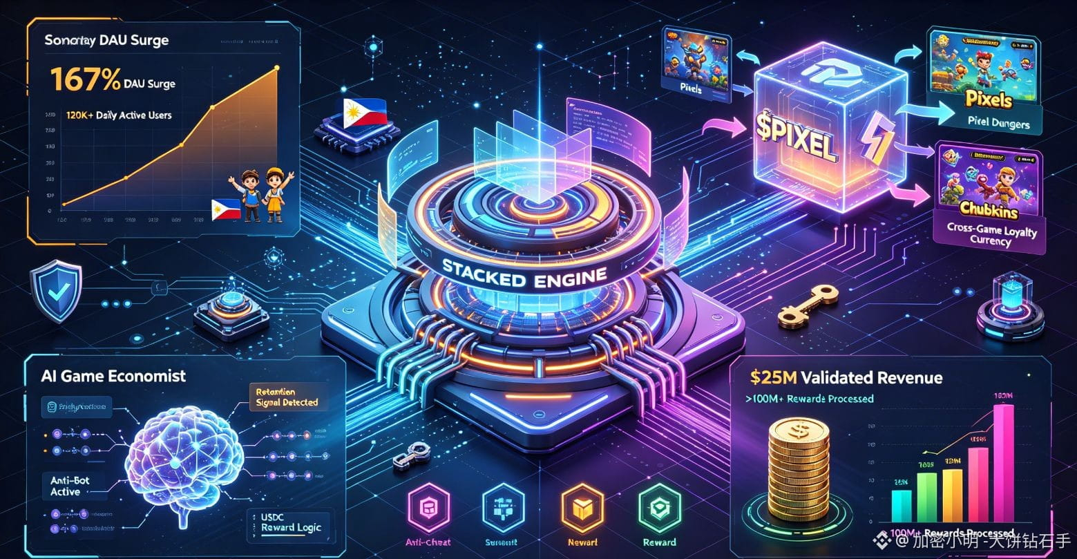 这也是为什么当@Pixels 最近甩出一个叫“Stacked”的东西时,我没像往常那样条件反射地去翻白皮书找破绽。因为这套东西不是发个白皮书就开吹的概念,而是一个已经跑通、帮Pixels赚了2500多万美元、处理了上亿次奖励发放的“奖励型LiveOps引擎”。更直白点讲:它要重新定义“玩游戏怎么赚钱”这件事,而且是用已经砸进去的2500万美金真金白银来重新定义。