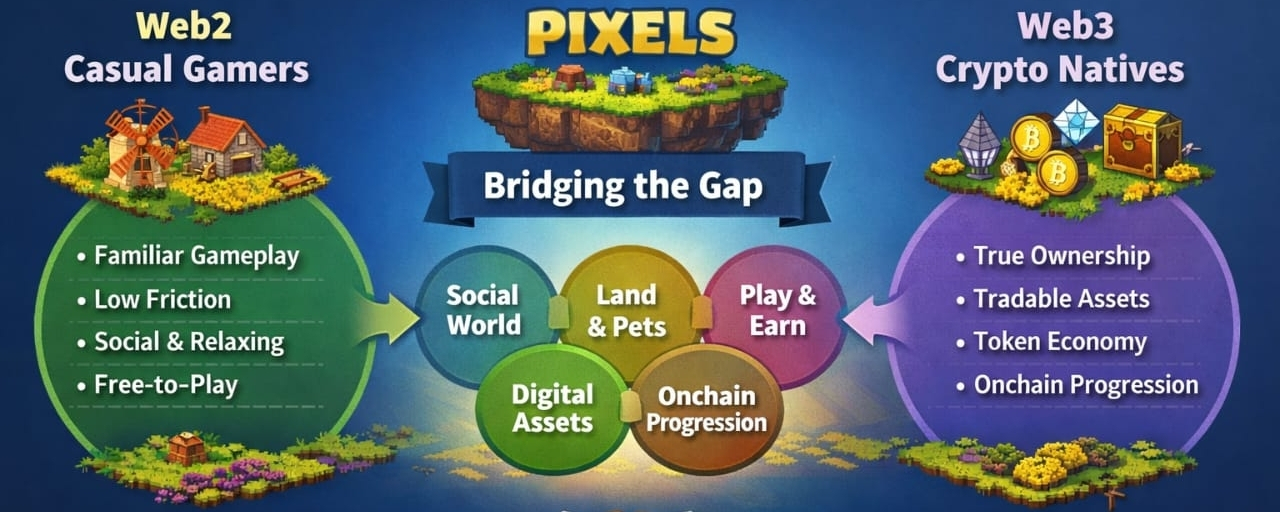 Pixels appeals to Web2 casual gamers because it leads with a familiar, low-friction, socially legible world. It appeals to Web3-native users because the economy, asset ownership, and wallet-linked progression are not entirely cosmetic. The bridge works because the product does not force both groups to value the same thing for the same reason. One comes for comfort and habit. The other comes for structure and ownership. The best case is that both eventually meet in the same world for different reasons.