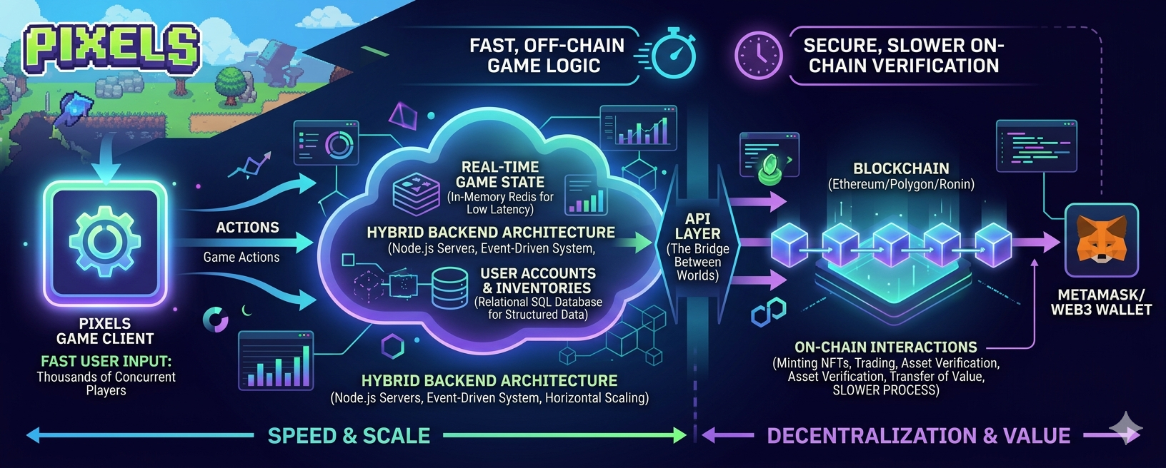 APIs act as the bridge between two worlds fast game logic and slower blockchain verification. It works, but it’s not purely decentralized. And that’s the trade-off Pixels accepts.