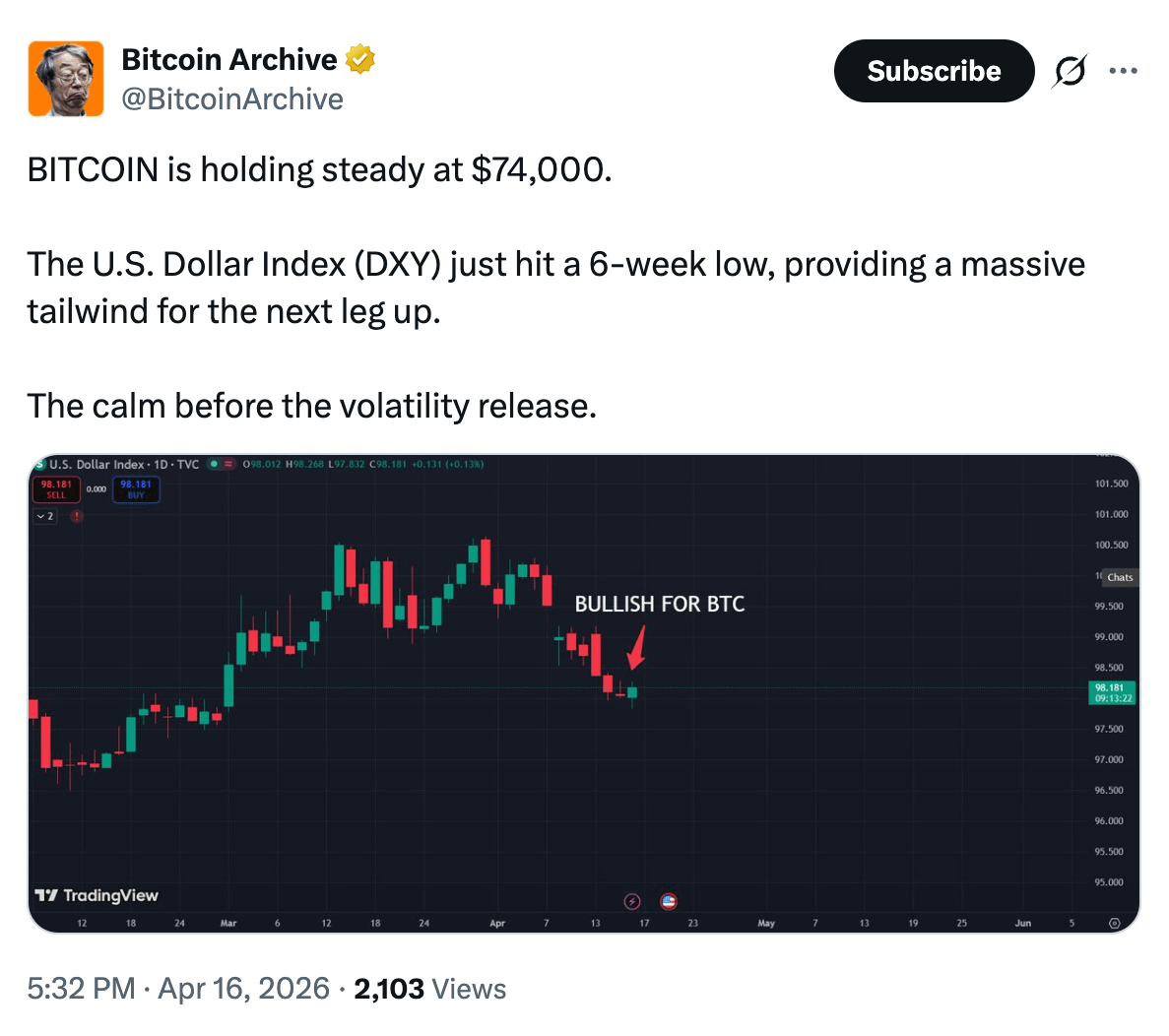 Kollege-Analyst Bitcoin Archive konzentrierte sich auf den fallenden US-Dollar-Index und sagte, dass er einen „massiven Rückenwind für den nächsten Anstieg“ für Bitcoin bietet.