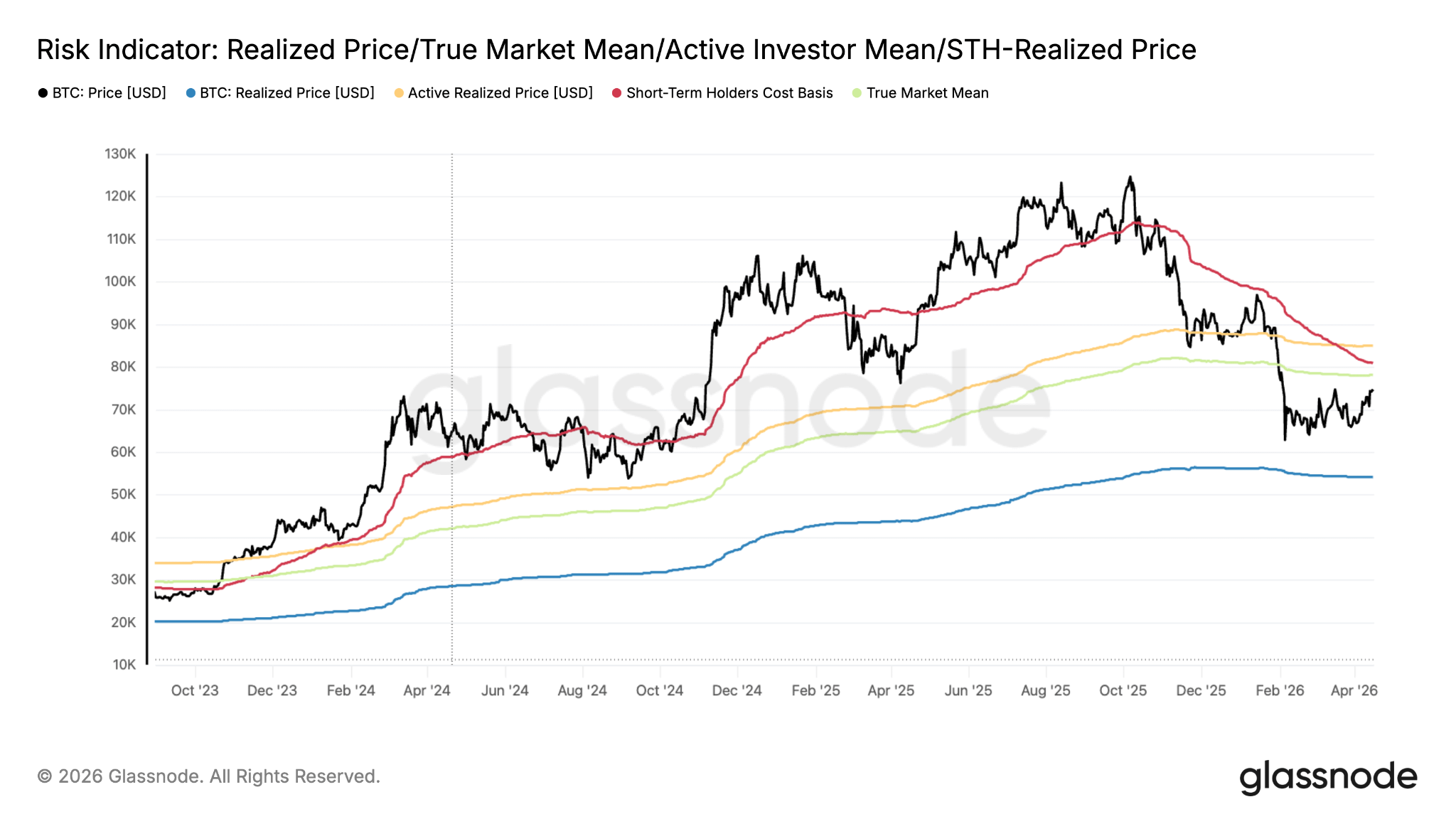 Bei 74.000 $ liegt Bitcoin 5,2 % unter dem wahren Marktmittel, einer Kennzahl, die die Kostenbasis des aktiven BTC-Angebots verfolgt.