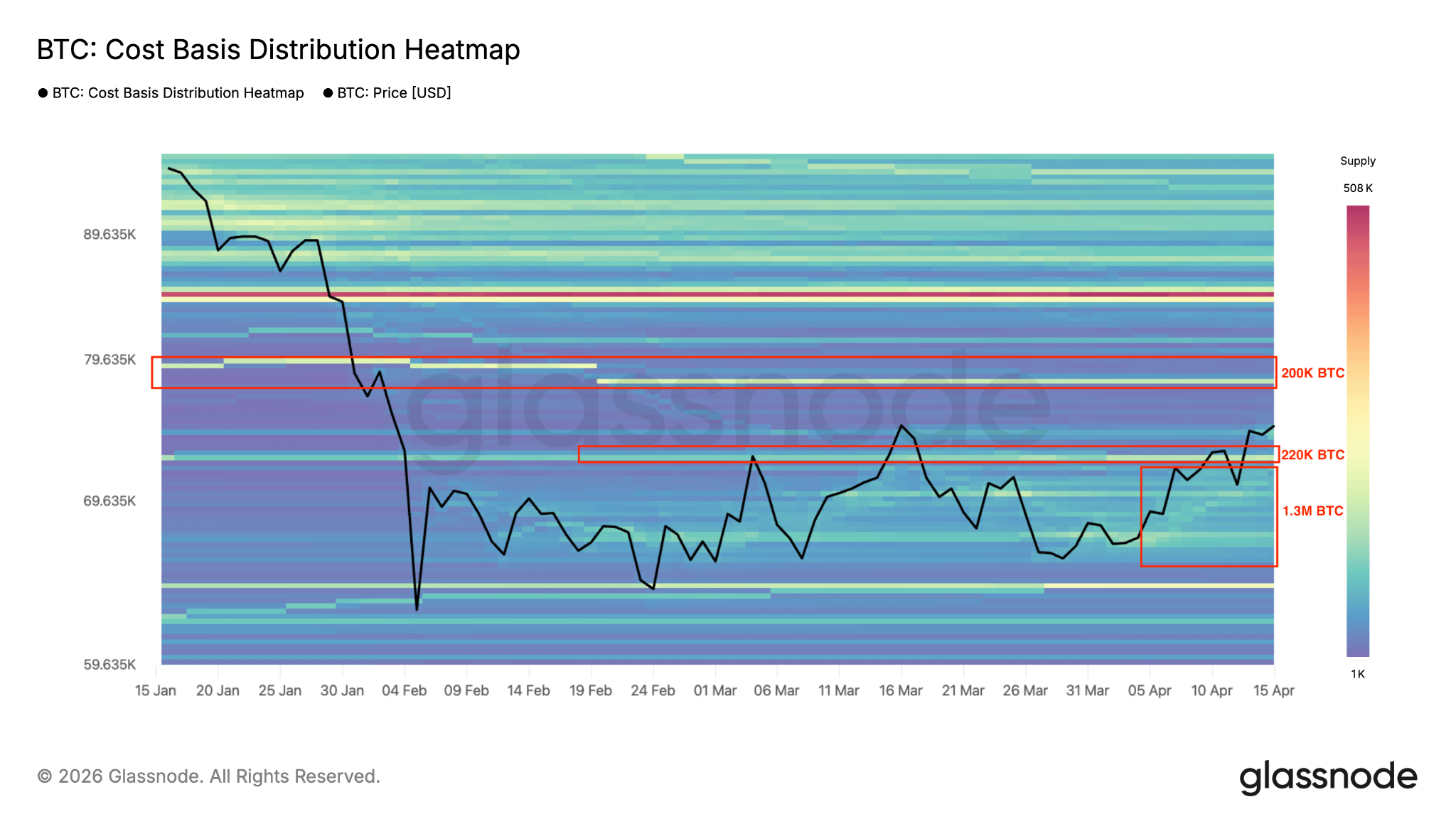 Die Bedeutung dieses Widerstandsniveaus wird durch die Kostenbasisverteilung verstärkt. Die untenstehende Heatmap zeigt, dass über 200.000 BTC für etwa 78.000 $ erworben wurden.