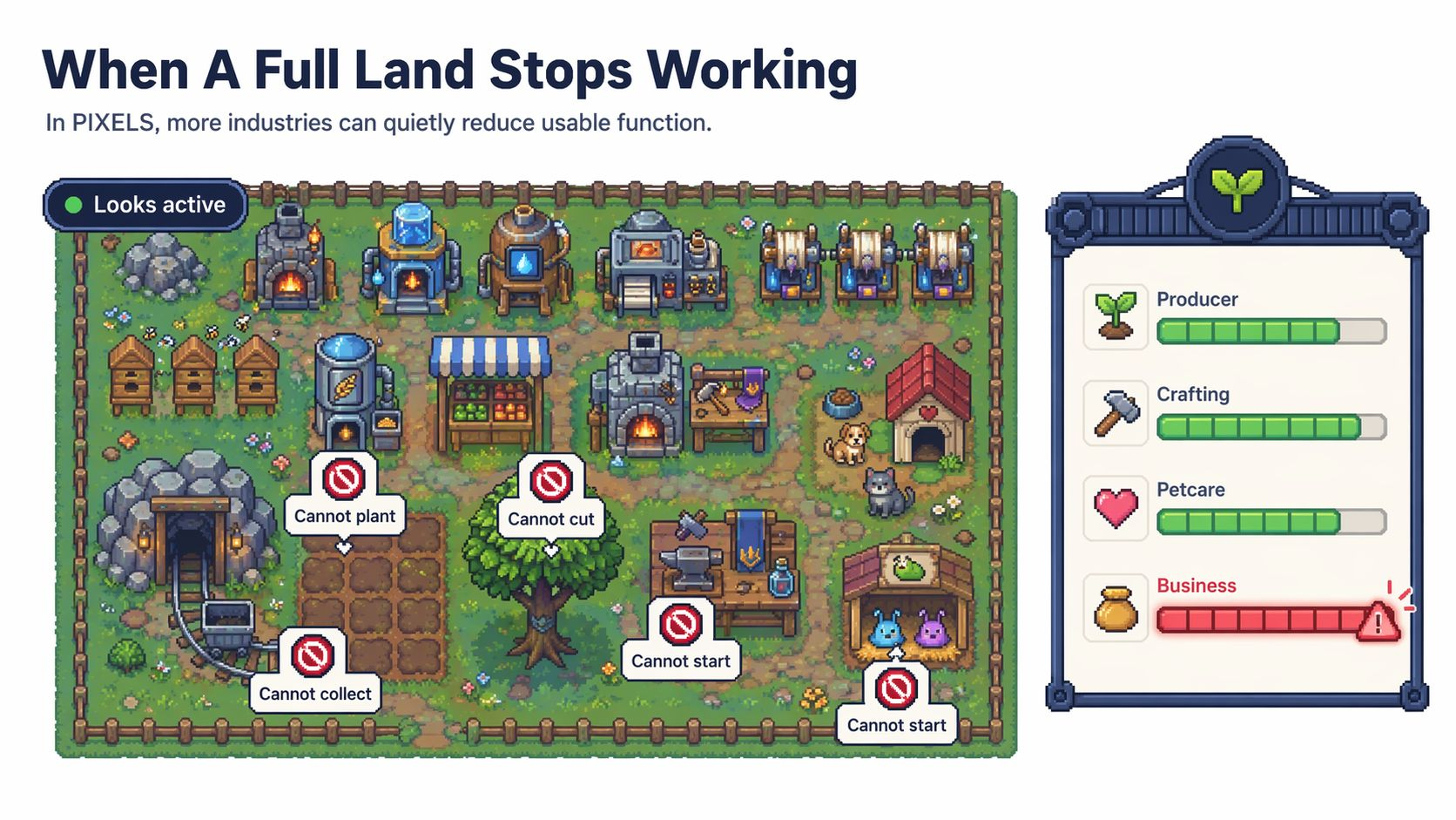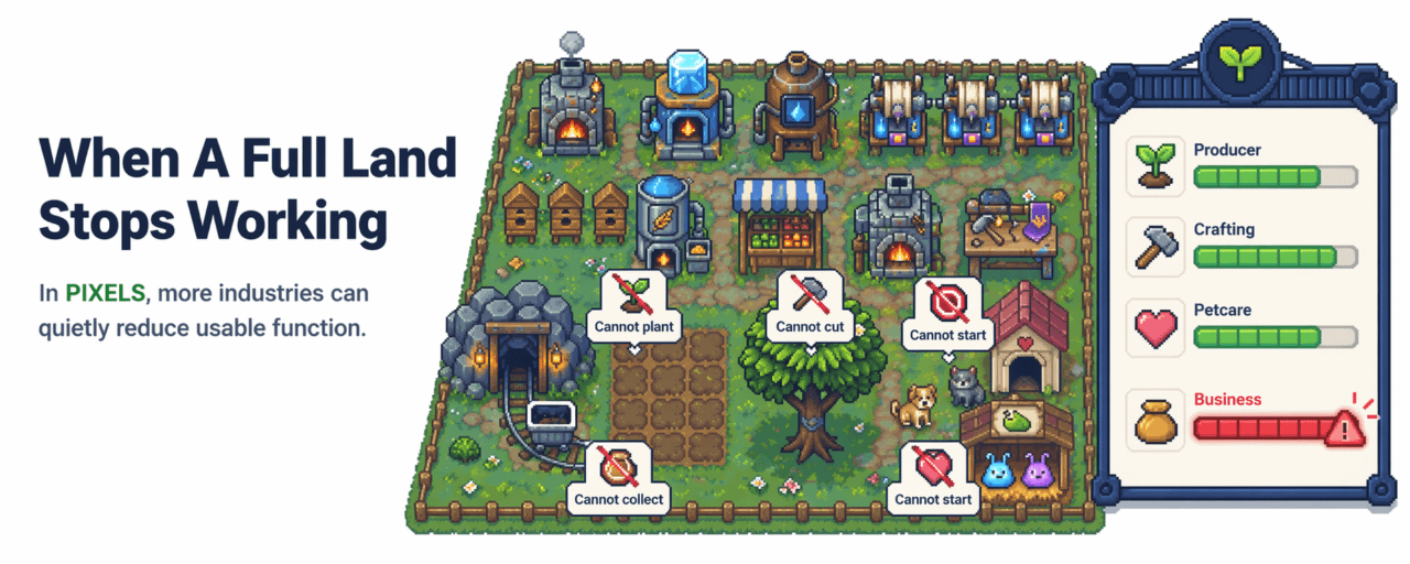 I used to build my land in PIXELS the same way I think a lot of grinders do when they get too locked in on squeezing value out of every tile. If I saw an empty spot, it bothered me. It looked unfinished. It looked like wasted output. So I kept filling it. More soil, more machines, more production nodes, anything that made the land look busy. In my head, if the map looked packed, that meant I was pushing harder and earning better. Pretty simple logic. Also wrong.