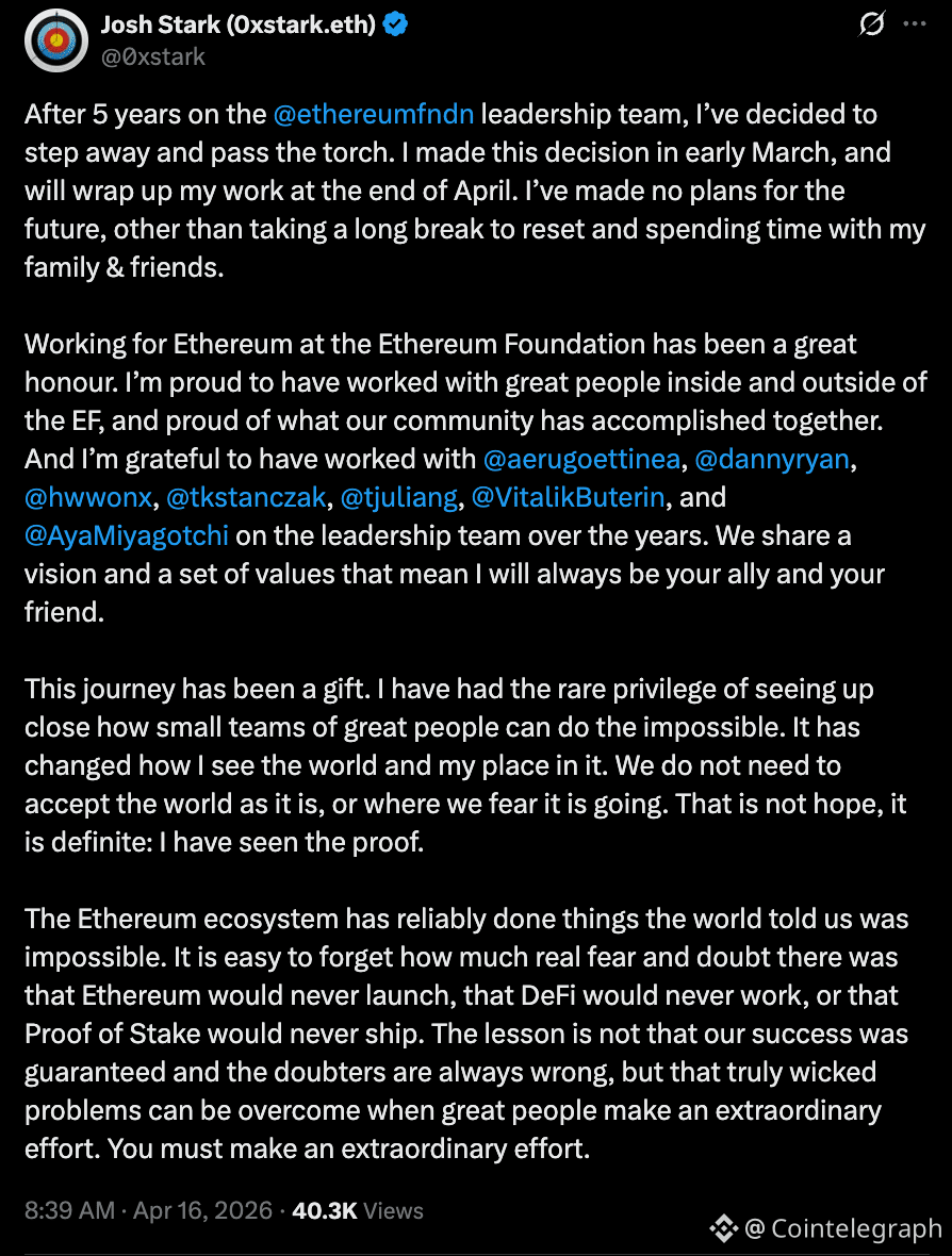 Josh Stark, ein führender Forscher und Projektmanager der Ethereum Foundation, der gemeinnützigen Organisation, die die Entwicklung des Ethereum-Ökosystems betreut, sagte am Donnerstag, dass er die Organisation nach fünf Jahren verlässt.