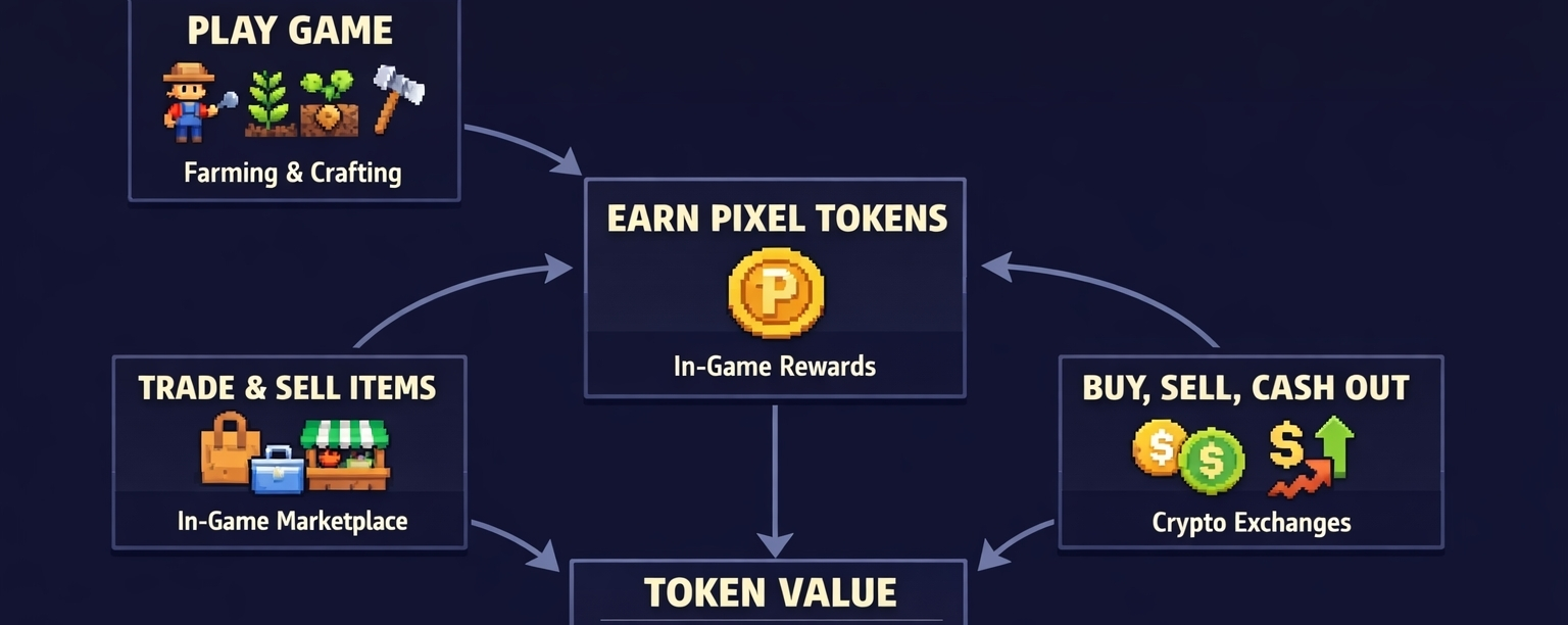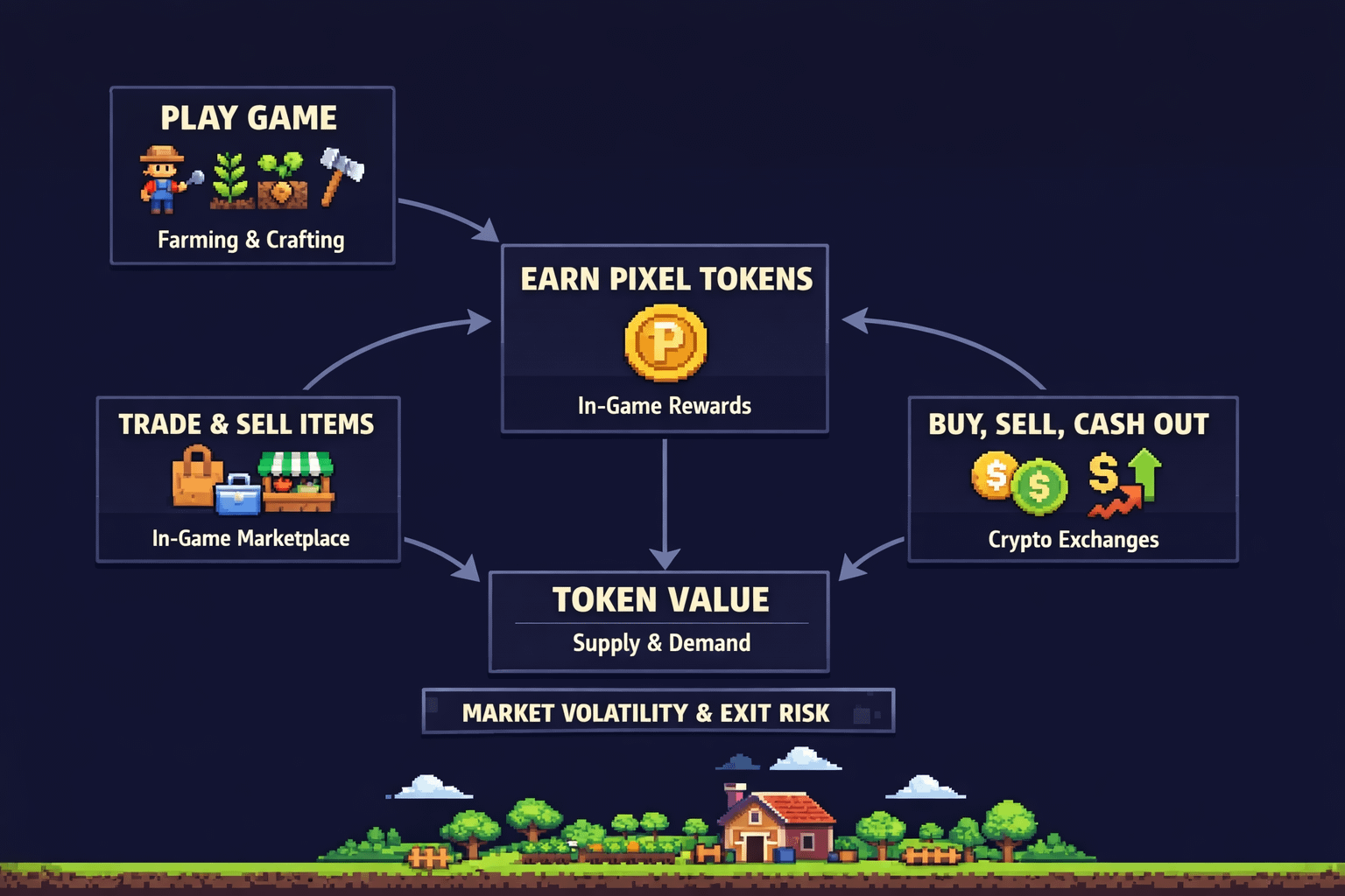 A simple game shows up. Friendly graphics. Easy mechanics. Farming, crafting, trading. Then comes the twist: you can earn real money while playing. That’s where Pixels positions itself, even if it dresses it up in softer language like “social casual” or “player-owned economy.”