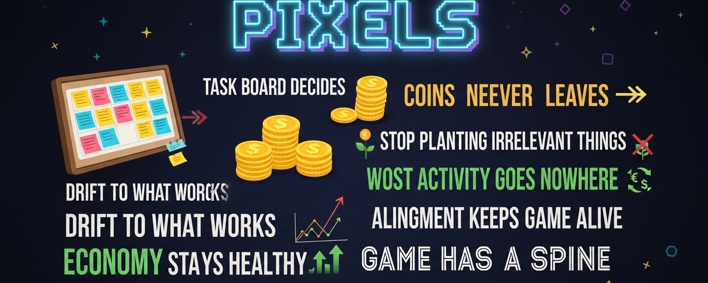 But here's the positive part. I don't think that shaping is evil. It lines up too cleanly. The things that keep getting surfaced are the ones that keep the economy moving in a healthy direction. The things that fade out are the ones that don't really matter beyond one player. So over time, players don't just converge. They align with what the system keeps selecting. And that alignment is what keeps Pixels alive and sustainable.