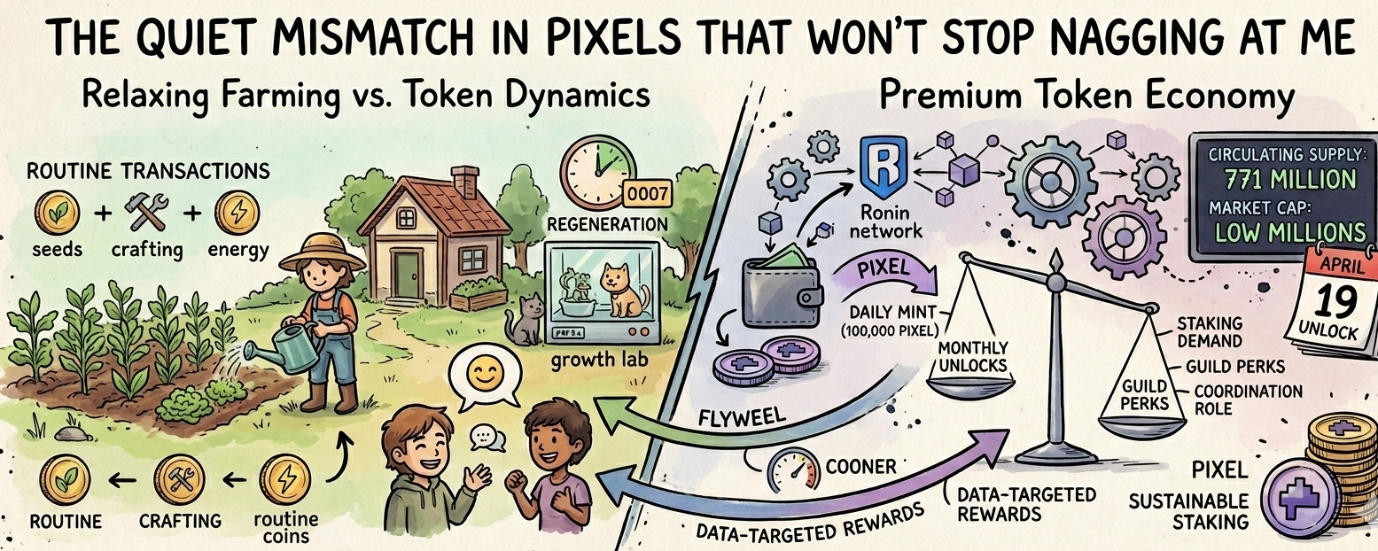 What keeps bothering me most is the thoughtful separation they built between the two economies. Everyday in-game coins handle the routine flow buying seeds, crafting at the kiln or textile mill, trading with NPCs, and restoring energy at the sauna. PIXEL serves as the premium coordination layer above it: staking for passive rewards, accelerating builds, unlocking cosmetics and guild perks, minting extra pets, or helping guide funding toward new games in the expanding platform. The architecture is smart a centralized backend quietly evaluates quests, social interactions and meaningful contributions to decide daily reward distribution, while the on-chain Ronin layer securely manages true ownership through land NFTs, pet transfers and seamless wallet connections. This creates an exceptionally smooth user experience where blockchain stays in the background, but it also puts quiet, ongoing responsibility on the incentive structure. Factors like certain wallet concentration and relatively thin liquidity on Katana pools (alongside major exchanges) add sensitivity, particularly when daily trading volumes often climb to 20–30 million a striking ratio relative to the current market cap.