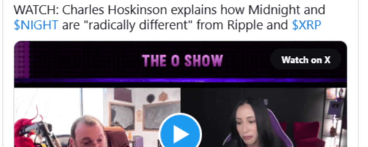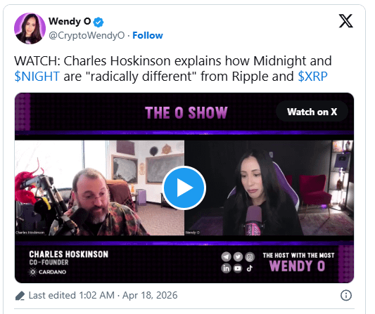 Crypto commentator Wendy O brought the discussion back into focus after sharing part of her interview with Charles Hoskinson, where he explained why Midnight and its governance token, NIGHT, are “radically different” from Ripple and XRP. Hoskinson argued that the difference goes beyond privacy technology and extends into how value is created and returned to token holders.