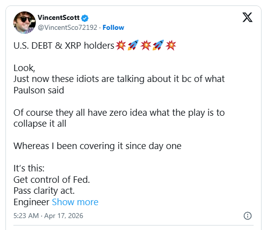 $XRP Publicly funded journalist Vincent Scott (@VincentSco72192) recently published a detailed theory about U.S. debt restructuring. His analysis goes further than most financial commentary, connecting Federal Reserve policy, crypto legislation, tokenization, and international currency competition into a single strategic sequence.