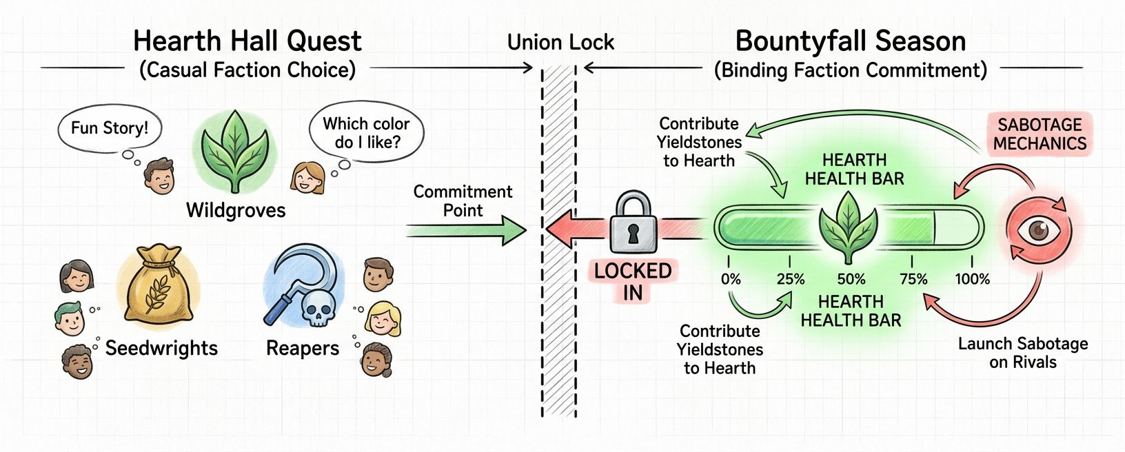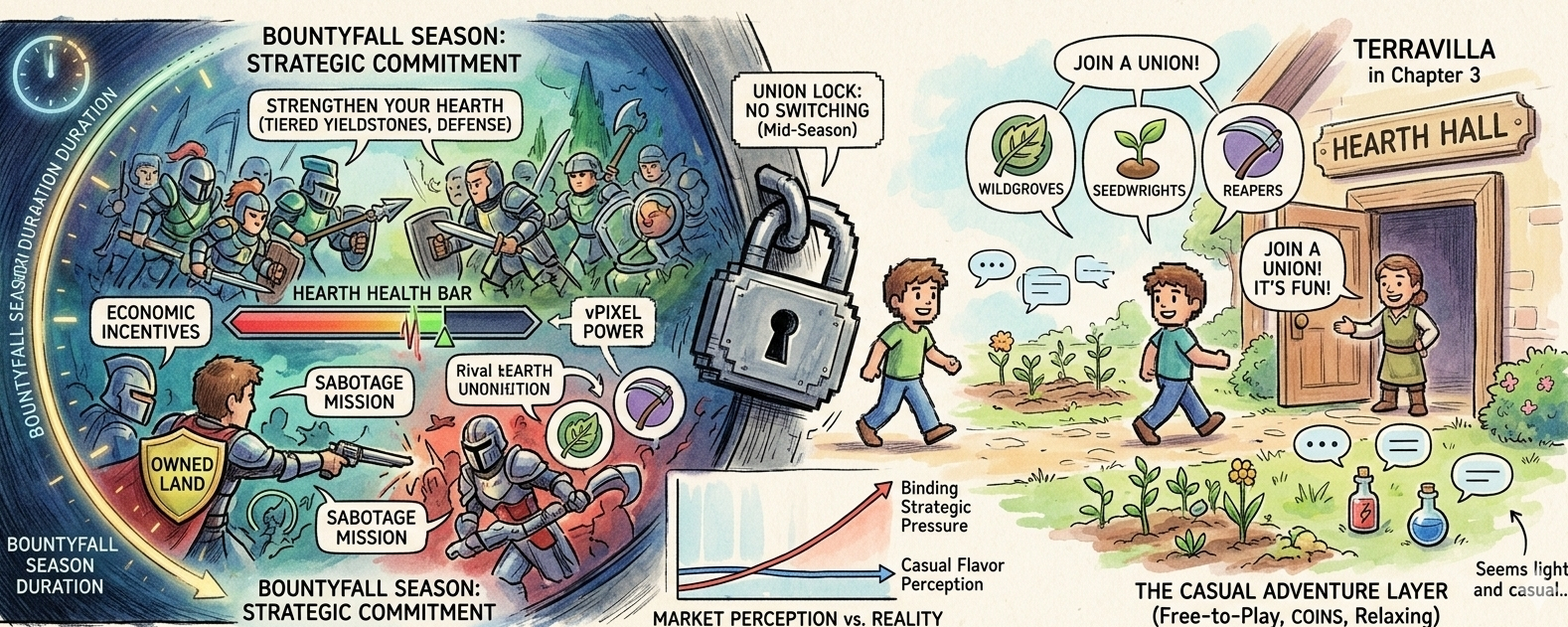 What keeps bothering me about Pixels is how the Hearth Hall quest in Terravilla makes choosing a Union feel like a light, fun story decision, but the moment you pick one it quietly locks you in for the entire Bountyfall season. I noticed it last week when I finally reached the hall and had to commit to Wildgroves, Seedwrights, or Reapers. The NPC dialogue made it sound casual, yet as soon as I chose, the sabotage mechanics and Hearth health bar turned that choice into something with real consequences. It felt strange because the game still presents itself as relaxed farming and exploration, but this one decision adds a layer of strategic risk most players probably don’t fully anticipate when they first walk in.