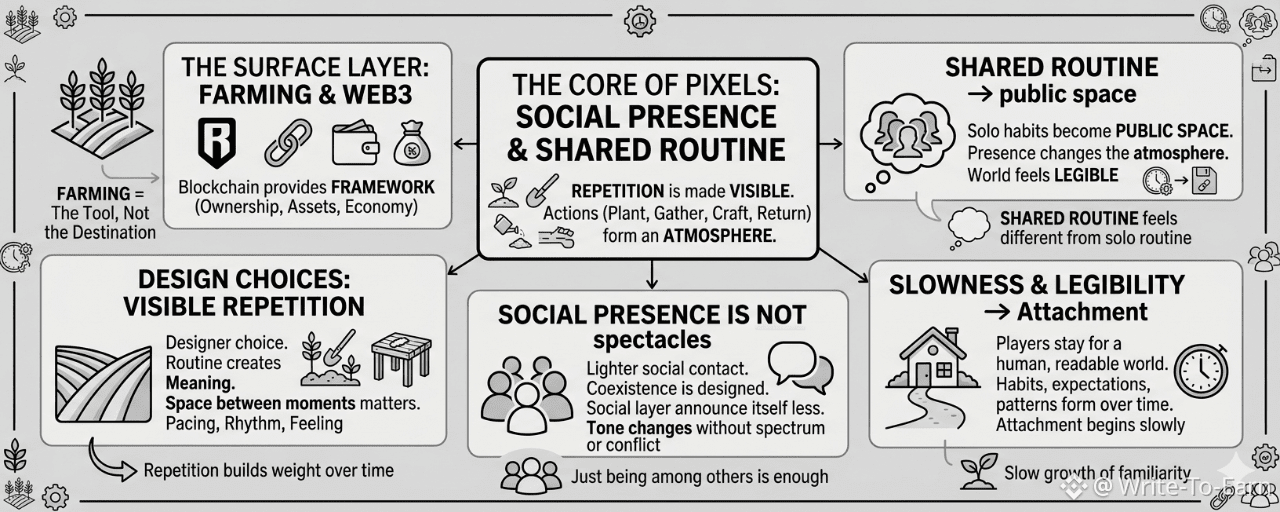 That sounds strange to say about a game built so heavily around farming, but after a while, that part starts to feel like the surface layer. Important, yes. Constant, definitely. But still just the surface. The deeper thing going on in Pixels is how it turns simple, repeated actions into a kind of social presence.