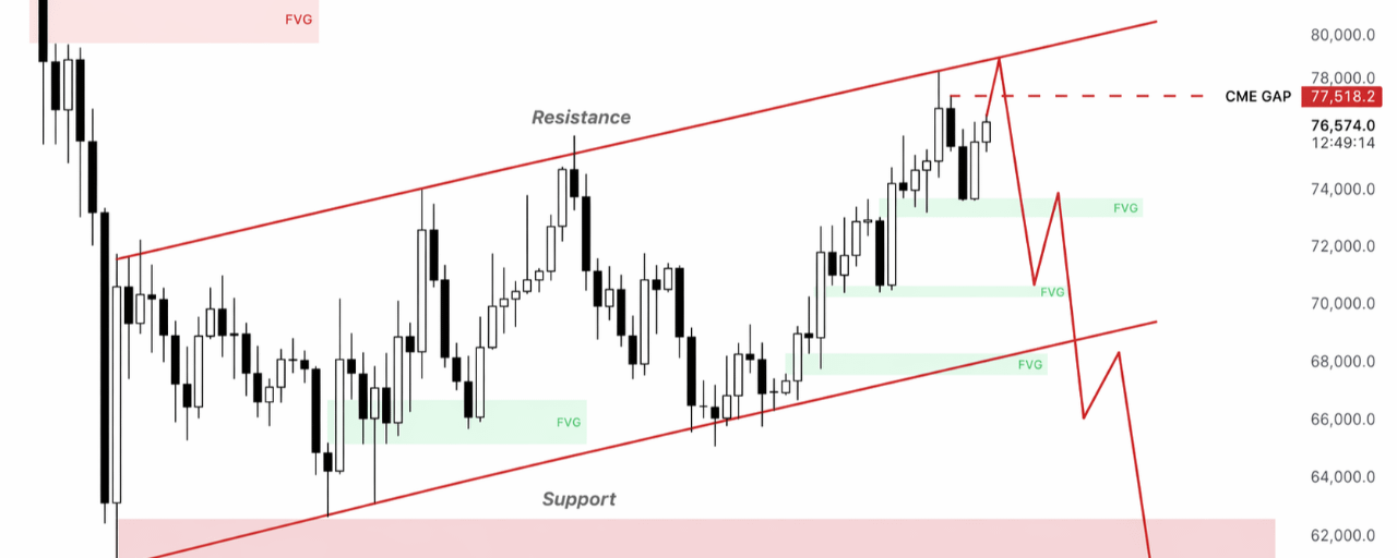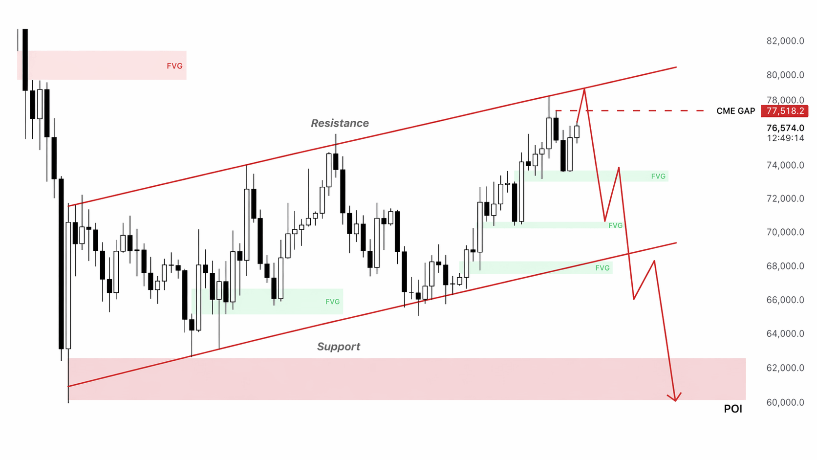 Der jüngste Aufwärtstrend findet hauptsächlich in einem klaren Aufwärtskanal statt, aber das Problem ist, dass der Preis direkt in den großen Angebotsbereich gedrückt wird. Dies ist der Bereich, in dem Gewinnmitnahmen und defensiver Verkaufsdruck jederzeit stark auftreten können. In diesem Kontext ist das wahrscheinlichste Szenario, dass Bitcoin einen letzten Push macht, um die CME-Lücke um die 77.500 USD zu schließen.