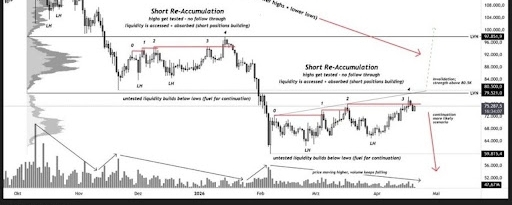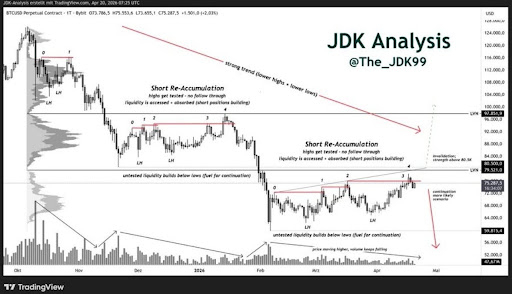 Sé que muchos estaban celebrando esos intentos de ruptura por encima de los $75,000, pero la realidad técnica es mucho más fría y estratégica de lo que parece. Según el análisis de expertos como JDK Analysis, lo que hemos vivido no son recuperaciones reales, sino "fakeouts" (falsas rupturas) diseñadas para atrapar a los más optimistas. Bitcoin ha intentado saltar la cerca cuatro veces y en las cuatro ha terminado de regreso en el corral. 🚩