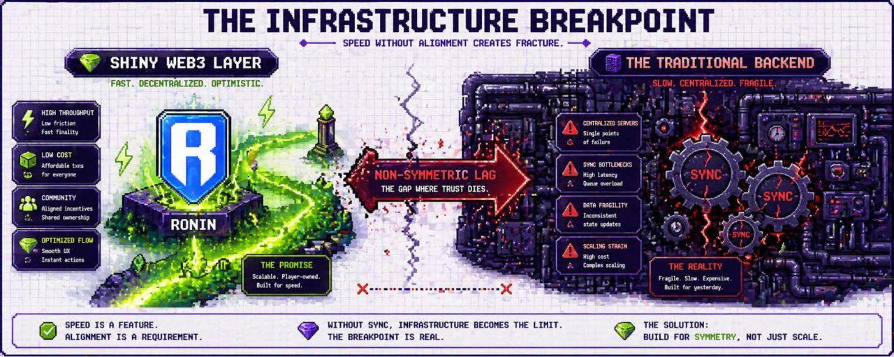 When a user executes a crop harvest or a trade, that action must be validated by the server before it ever touches the #RONIN network. If the backend lag exceeds 100ms, you get a "Desync Event". In 2026, this isn't just a technical glitch; it’s an economic failure that leads to missed actions and asset loss.