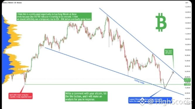 Ich denke, das ist eine ziemlich gute Gelegenheit, Bitcoin auf diesen Niveaus zu kaufen/long zu gehen, da auch der RSI-Indikator beginnt, überverkauft zu sein. Ich denke, wir sollten definitiv einen vorübergehenden Anstieg auf 83k - 84k sehen, bevor es schließlich niedriger geht. Es hängt vom Muster des fallenden Keils ab - werden die Bullen stark genug sein, um aus diesem Muster auszubrechen? Wir werden sehen, aber im Moment wollen wir diese starke Unterstützung von 72k kaufen!