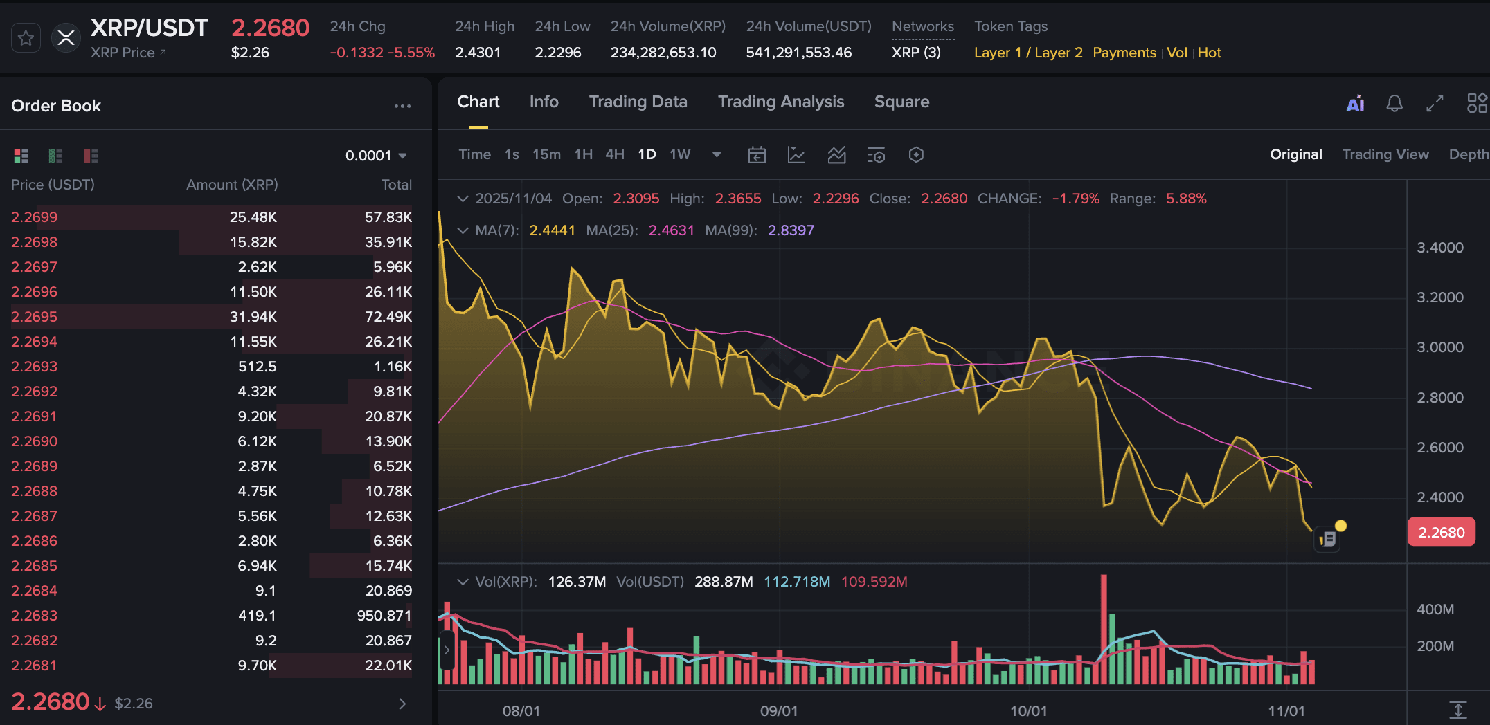 XRP price has fallen close to 6% in the past 24 hours, nearing the lower boundary of its $2.20–$2.70 trading range