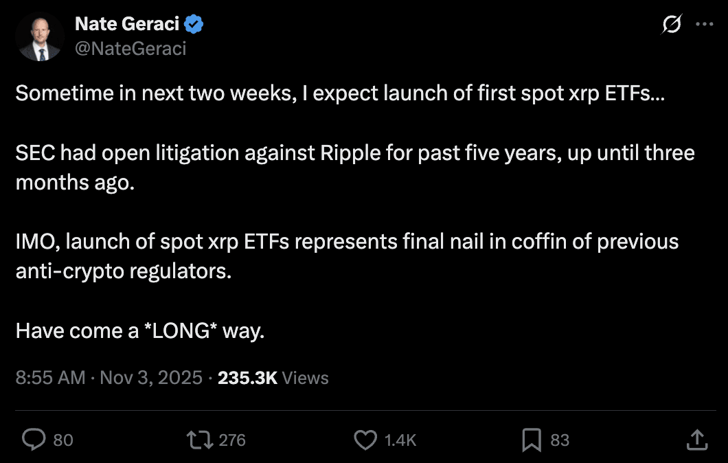 In an X post, Nate Geraci wrote that the anticipated approvals signal a significant shift in US regulatory sentiment toward crypto assets.