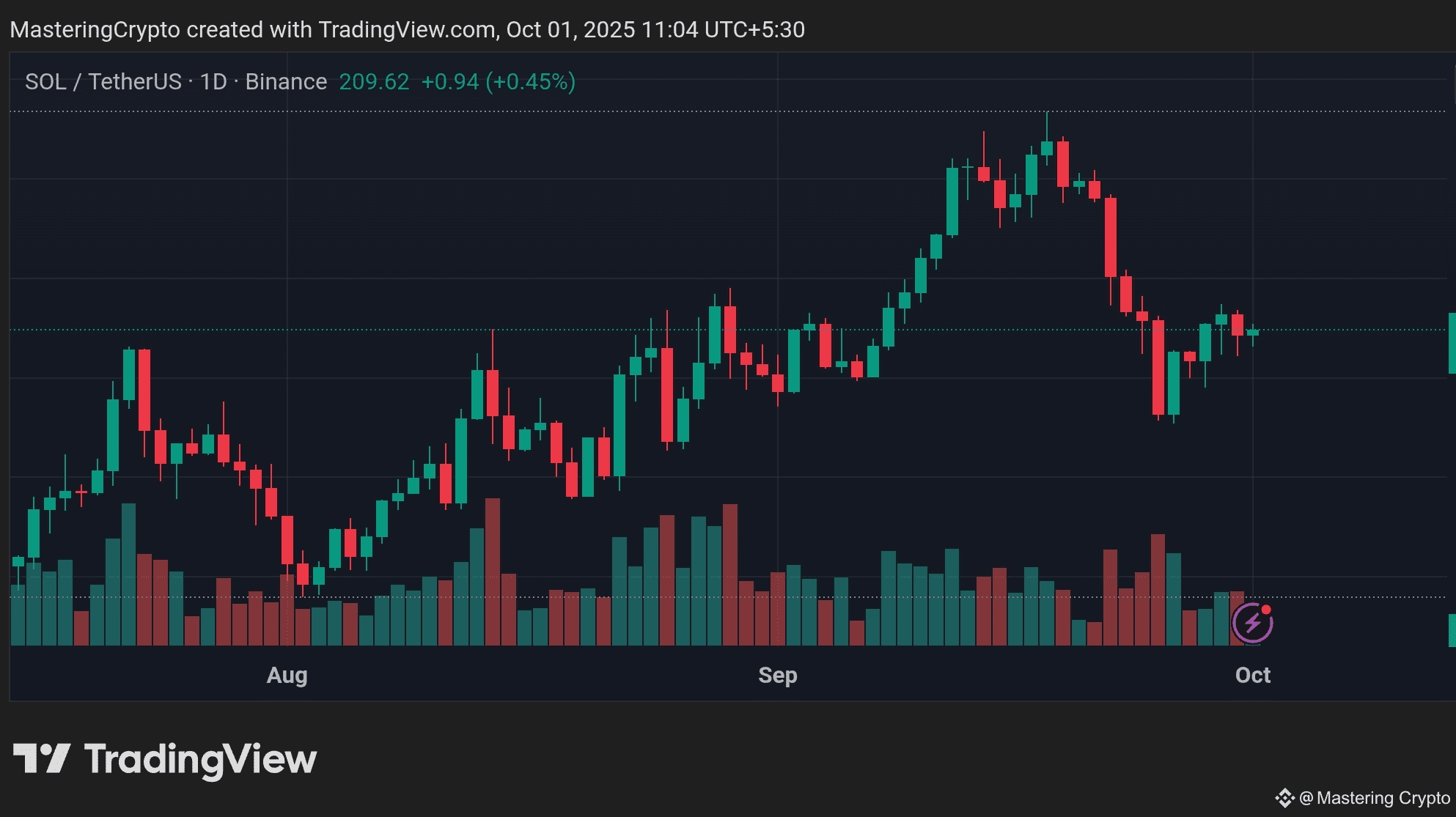 Solana ($SOL ) exhibited a mixed monthly performance in September 2025, breaking its four-year streak of positive September returns. The token started strongly, peaking at around $253.51 on September 18 but fell approximately 17% by month-end to close near $210. This reversal was driven by waning bullish sentiment and declining network activity.