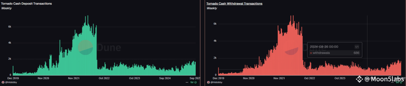 Even as the number of large-scale hacks declined, activity on Tornado Cash surged. Deposits and withdrawals have more than tripled since June, signaling hackers are aggressively laundering and dispersing their stolen assets.