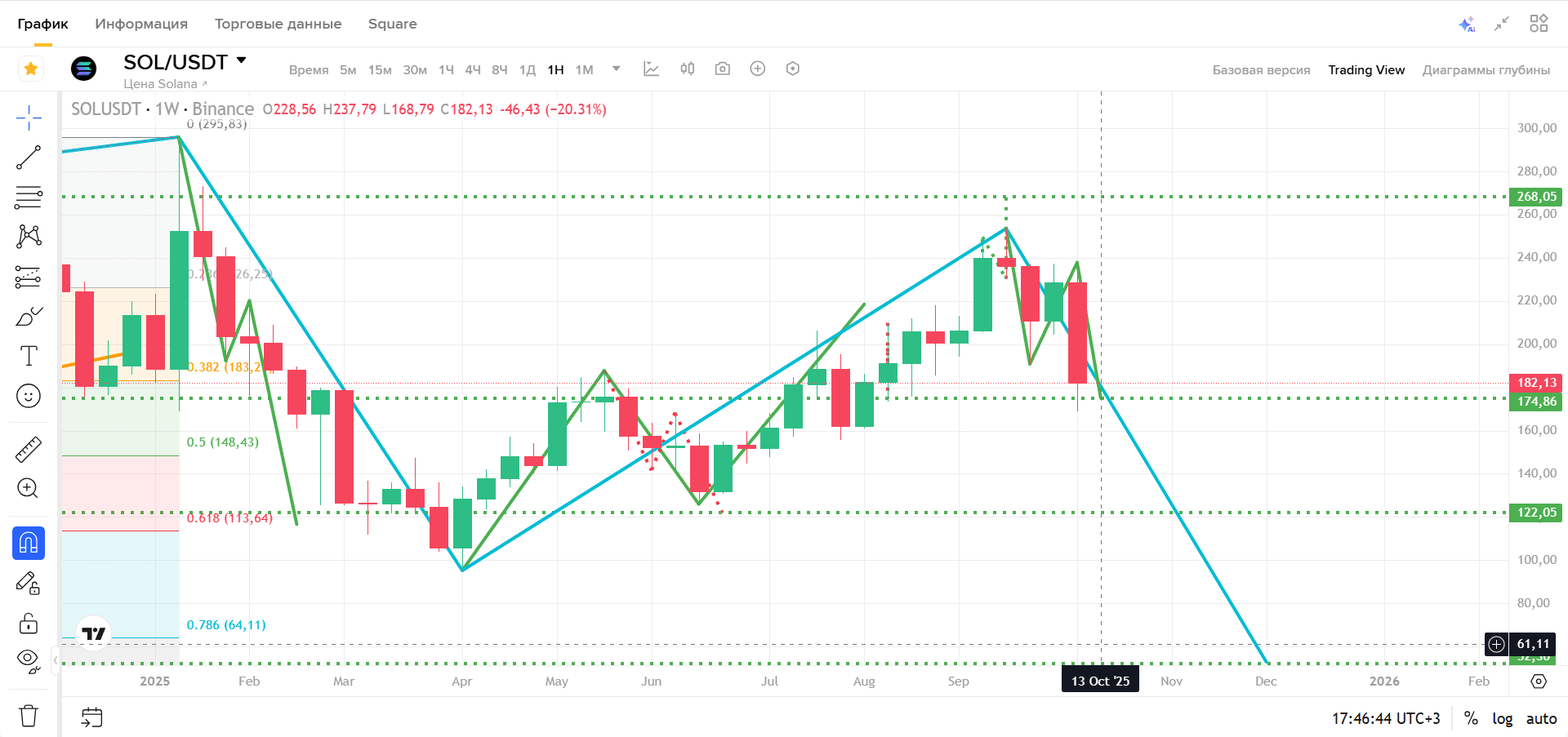 Аналогичную картину SOL сформировала и на графике 1W. Будут ещё сомнения, что SOL постепенно в течение одного года упадёт до 47.85??